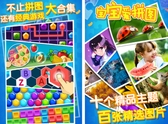 游戏涵盖10个精品主题以及超多惊险的图片,除了能够让宝宝在拼图游戏的世界里面乱练动手能力以及思维能力,除此之外,还有很多经典的游戏,比如连连看以及泡泡龙等大家耳熟能详的玩法,每一种都是需要开动脑筋的画面特别的清晰,包括在展开拼图的时候,图片类型也很丰富,涵盖了现实生活中的真人以及动物等。