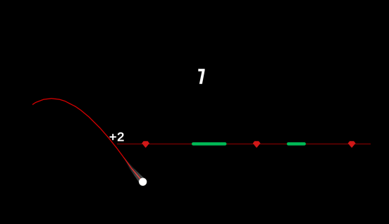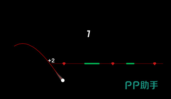 游戏有着黑色的背景,还有着比较简单的操作方法,玩家需要控制小球及时的躲避障碍,如果能够连续画出曲线的情况下就能够获得分数,而且曲线越长获得的分数也会越高。在每一次体验的过程当中,及时的按住屏幕上的小球,就可以完成向上加速转动,考验玩家的手速反应能力以及速度感。因为在越过红线,松开手指以后,需要等到红线以下,才能够再次进行加速。