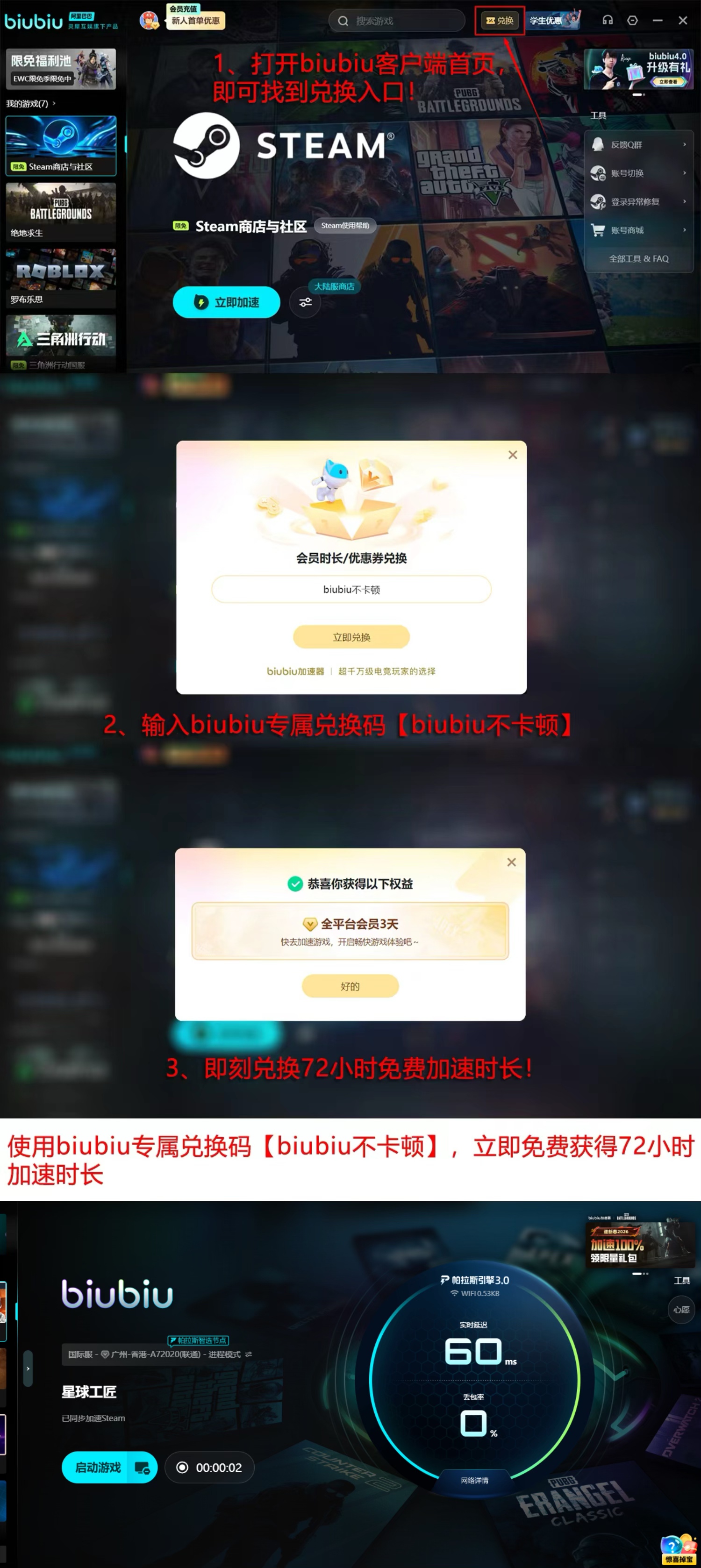 为便于用户实际验证效果,平台面向新注册用户开放24小时全功能免费加速时长,完成账号激活后自动到账。此外,所有用户均可凭通用兑换码【biubiu不卡顿】,即时兑换3天高级加速服务,无需绑定支付方式。