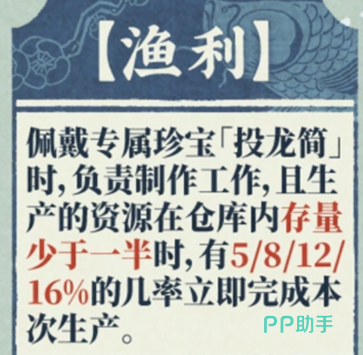 她的“渔利”会在佩戴专属珍宝“投龙筒”的时候,负责制作工作,此时生产的资源如果在仓库内存量少于一半,就会有5%、8%、12%、16%几率立刻完成本次的生产,进一步提升效率。
