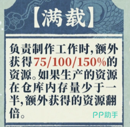 钟雪渔的技能有“满载”和“渔利”,“满载”可以在负责制作工作时,根据等级,来额外获得75、100、150%的资源,如果在生产的资源在仓库内存量少于一半,额外获得的资源量会直接翻倍。