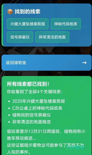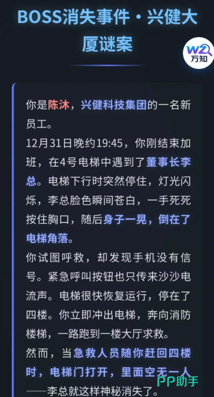 玩家将扮演一家大型科技集团的新入职员工,在李总离奇失踪后被警方列为重要调查对象。为摆脱嫌疑、还原真相,必须在布满智能终端与监控系统的现代化写字楼内展开自主探索——从故障电梯间到数据机房,从门禁日志到员工工牌,每一处细节都可能成为破局关键。