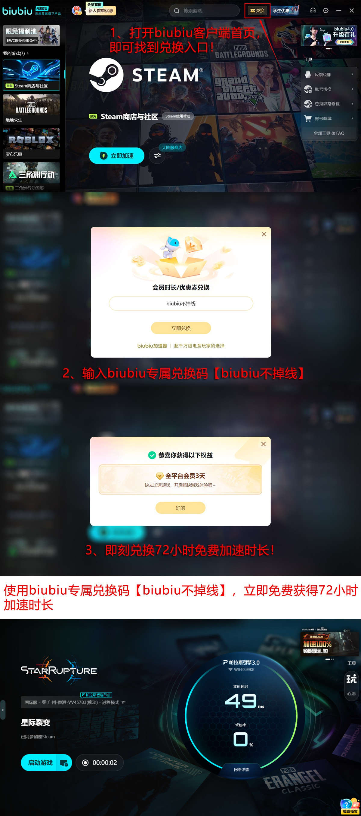 新用户注册即享分阶段免费权益:首日自动激活24小时全功能试用;完成新手引导后输入专属口令【biubiu不掉线】,额外解锁72小时高级加速权限;两项叠加总计可获得96小时无限制加速服务,覆盖完整新手成长周期与首次大型联盟战役,彻底规避因网络波动引发的闪退困扰。