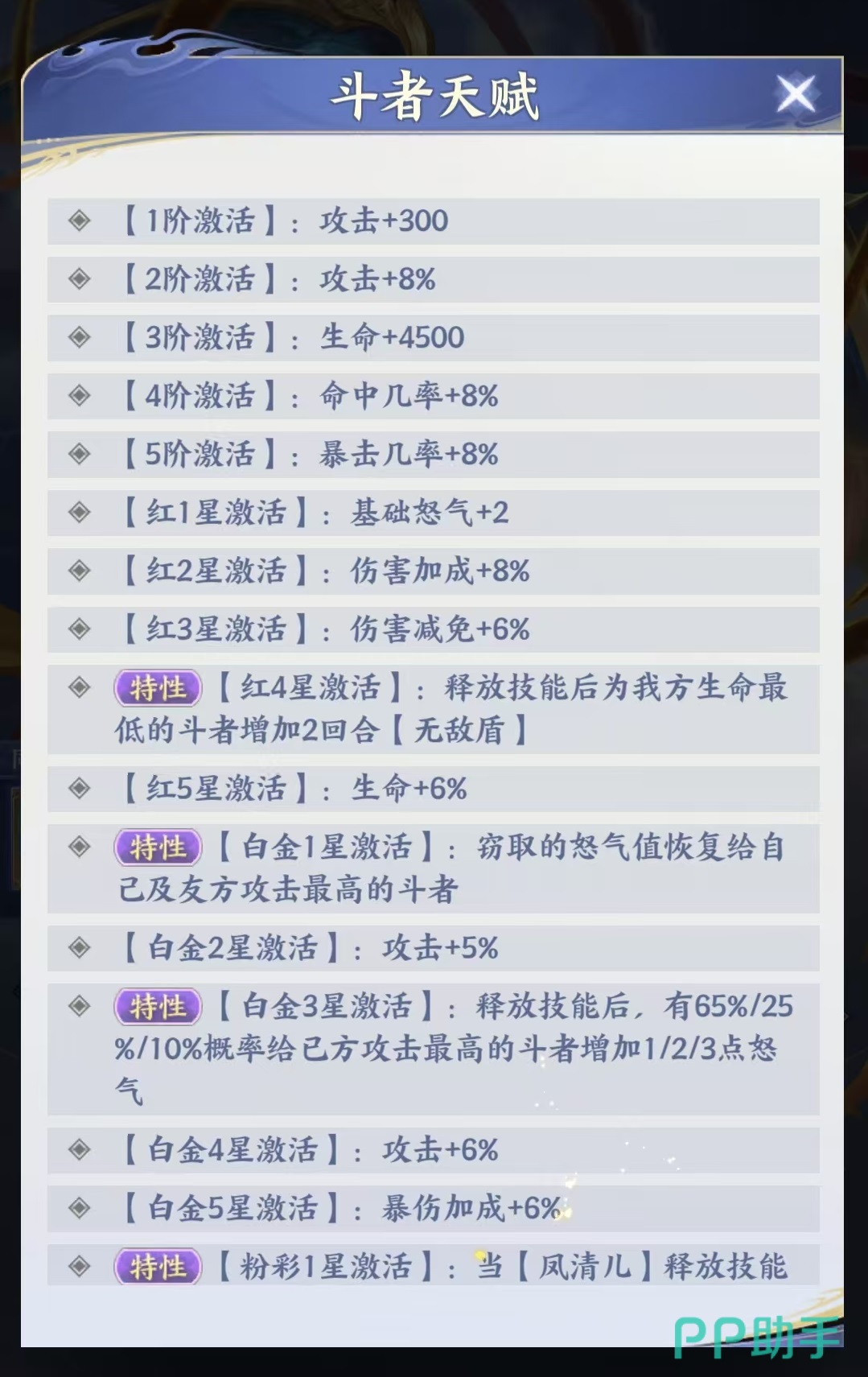 凤清儿的核心技能具备多重战略价值:一是可对敌方后排目标发动攻击并有概率窃取1点怒气,干扰对手大招释放节奏;二是当星级提升至红色四星后,技能命中后将为我方生命值最低的斗者施加持续两回合的无敌护盾,确保关键单位免于暴毙;三是晋升至白金一星时,所窃取的怒气将同步返还给己方攻击力最高的斗者;四是达到白金三星后,技能释放后额外触发概率性增益,为攻击最高单位追加怒气,既加速自身技能循环,也强化主C输出效率;五是粉彩一星阶段,凤清儿每次施放技能后,雷尊者将立即进行一次额外行动,该联动机制要求二者必须共存于阵容,否则无法激活完整效果。