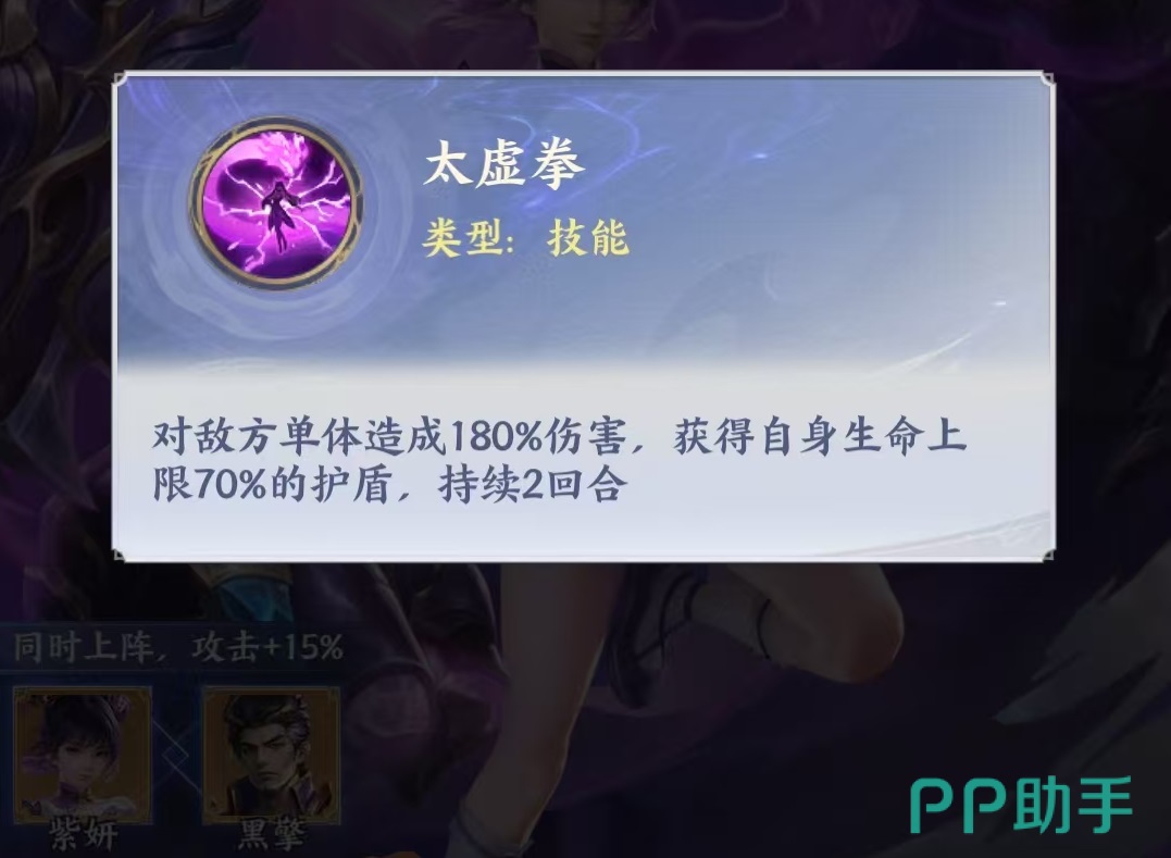 核心技能“太虚拳”为紫妍提供稳定作战价值:释放后对敌方单体造成高额伤害,并立即生成相当于自身最大生命值70%的护盾,持续两回合。随星级提升,该技能将解锁进阶效果——可为全体友方分摊50%所受伤害;每次承受攻击时,按当前生命百分比额外生成护盾;且有概率削减攻击者怒气值。多重机制叠加使其成为功能性极强的战术支点:既可稳固前排防线,又能通过怒气压制延缓敌方大招释放频率,虽无硬控效果,但具备实质性的战场节奏干预能力。