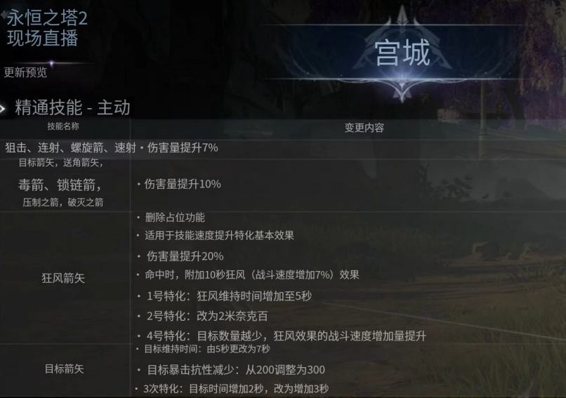 5、弓星:多段核心技能完成强化——狙击、连射、螺旋箭、毒箭、锁链箭等伤害分别提升7%或10%;狂风箭矢机制重构:移除原有占位判定,基础伤害提升20%,命中后为目标附加持续10秒的“狂风”状态,使目标战斗速度提升7%;特化4技能强化幅度最大:狂风效果随目标数量减少而递增,适用于残局收割场景。