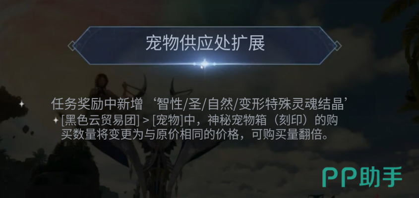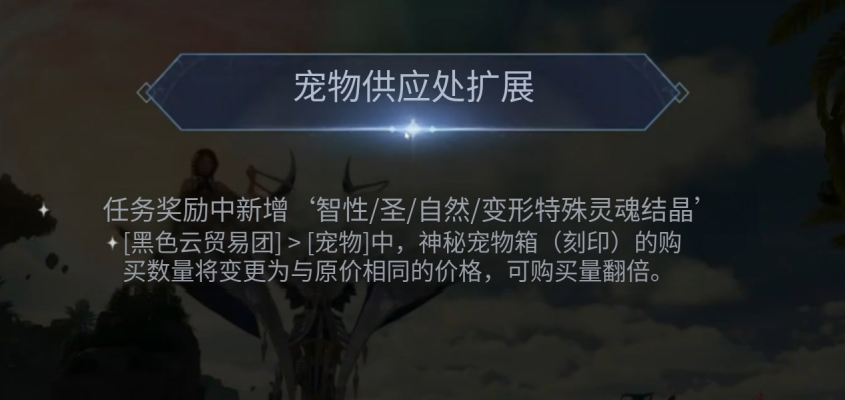 宠物养成资源扩容:新增多种类型灵魂结晶作为任务奖励;获取途径多元化,覆盖日常委托、指令类特殊任务;黑云商城中“神秘宠物箱”单日限购数量翻倍,供给量大幅提升。