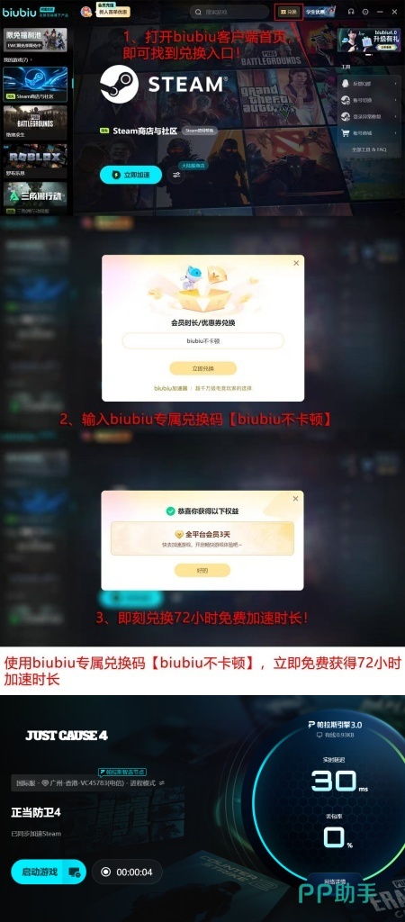 新用户注册后可立即获得24小时全功能免费试用权限。输入兑换码【biubiu不掉线】还可额外激活3天连续加速服务,累计享有96小时无限制加速体验。