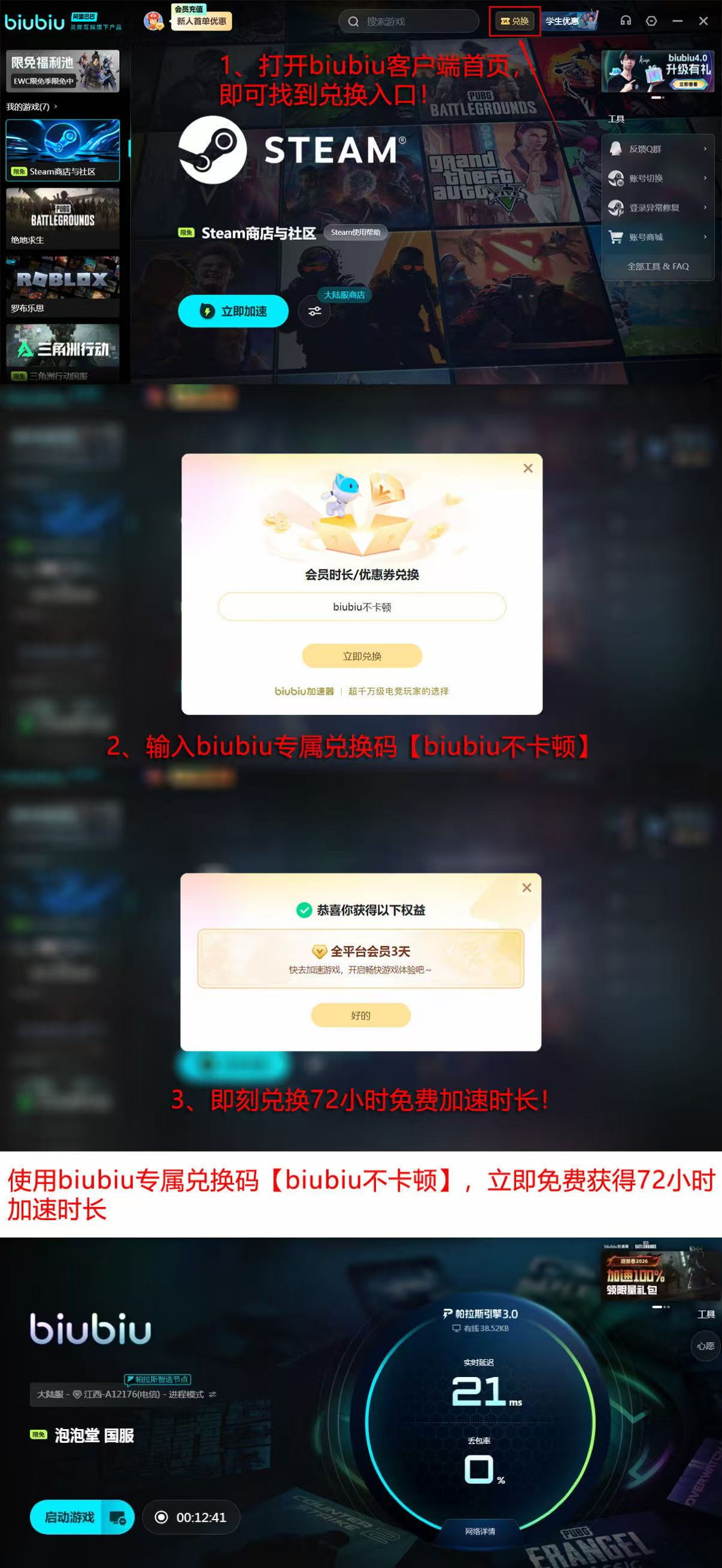 目前biubiu面向新用户提供注册即赠24小时全游戏免费加速权益,覆盖泡泡堂国服及其他千款热门游戏。所有用户均可凭兑换码【biubiu不卡顿】领取额外3天加速时长。此外,针对泡泡堂国服特别推出限时免会员加速活动,即使未开通正式订阅,也能享受完整加速服务。站内同步开放超千款游戏限免加速入口,欢迎体验。