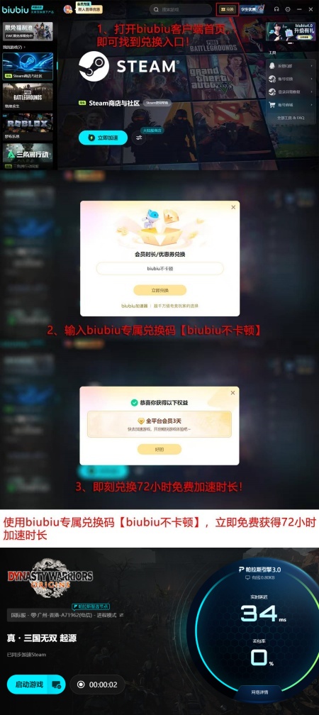 面向新用户,平台提供分层激励机制:注册后自动解锁24小时全游戏免费加速权限;输入专属兑换码【biubiu不卡顿】,还可额外获得72小时加速时长。