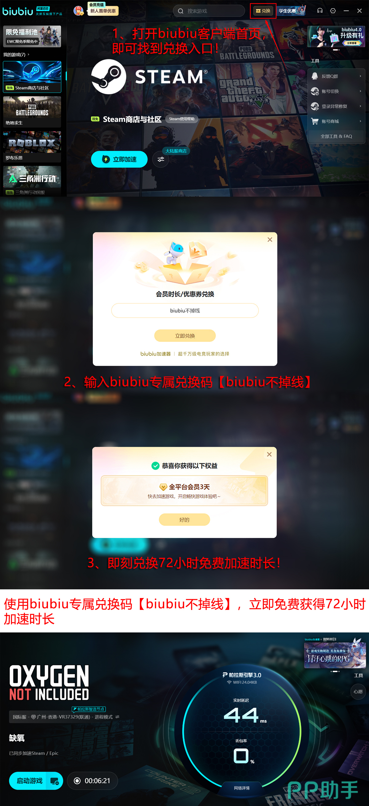 当前新用户注册即享多重权益:首赠24h免费加速时长;输入兑换口令【biubiu不掉线】,额外获得72h服务权限;两项叠加后,总计可使用96h加速服务,充分满足新手期全流程体验需求。