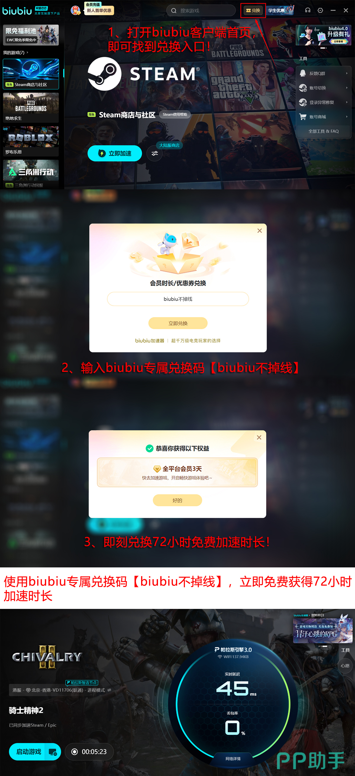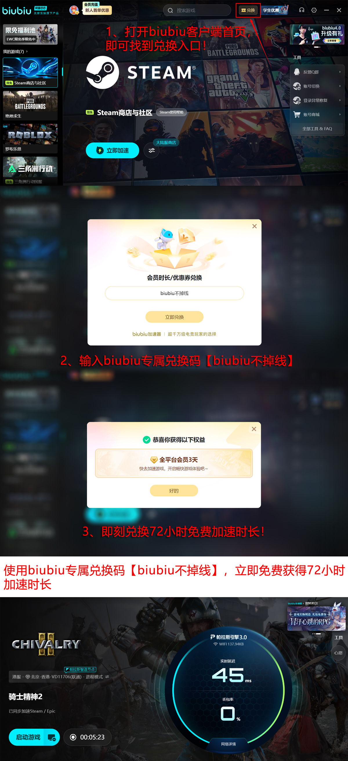 新用户注册后即可领取入门礼包,包含24小时全功能免费试用权限。此外,通过活动入口【biubiu不掉线】可额外兑换72小时加速服务时长,两项权益叠加后,首期总可用时长达96小时,充分覆盖新手熟悉期与初期内容体验需求。