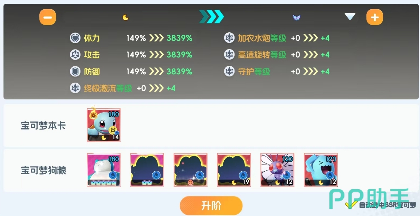第一重门槛为升阶要求:目标宝可梦须从“月亮1阶”起始,连续完成16次升阶,最终抵达“天使1阶”,方可开启MEGA进化资格。该过程需消耗大量同系养成资源:14只同系“月亮1阶”宝可梦作为主升阶材料;另需1只“皇冠5阶”、2只“皇冠1阶”、1只“太阳1阶”及33只“月亮1阶”宝可梦作为辅助狗粮。全部素材必须与目标宝可梦属性系别完全一致,资源投入强度极高。