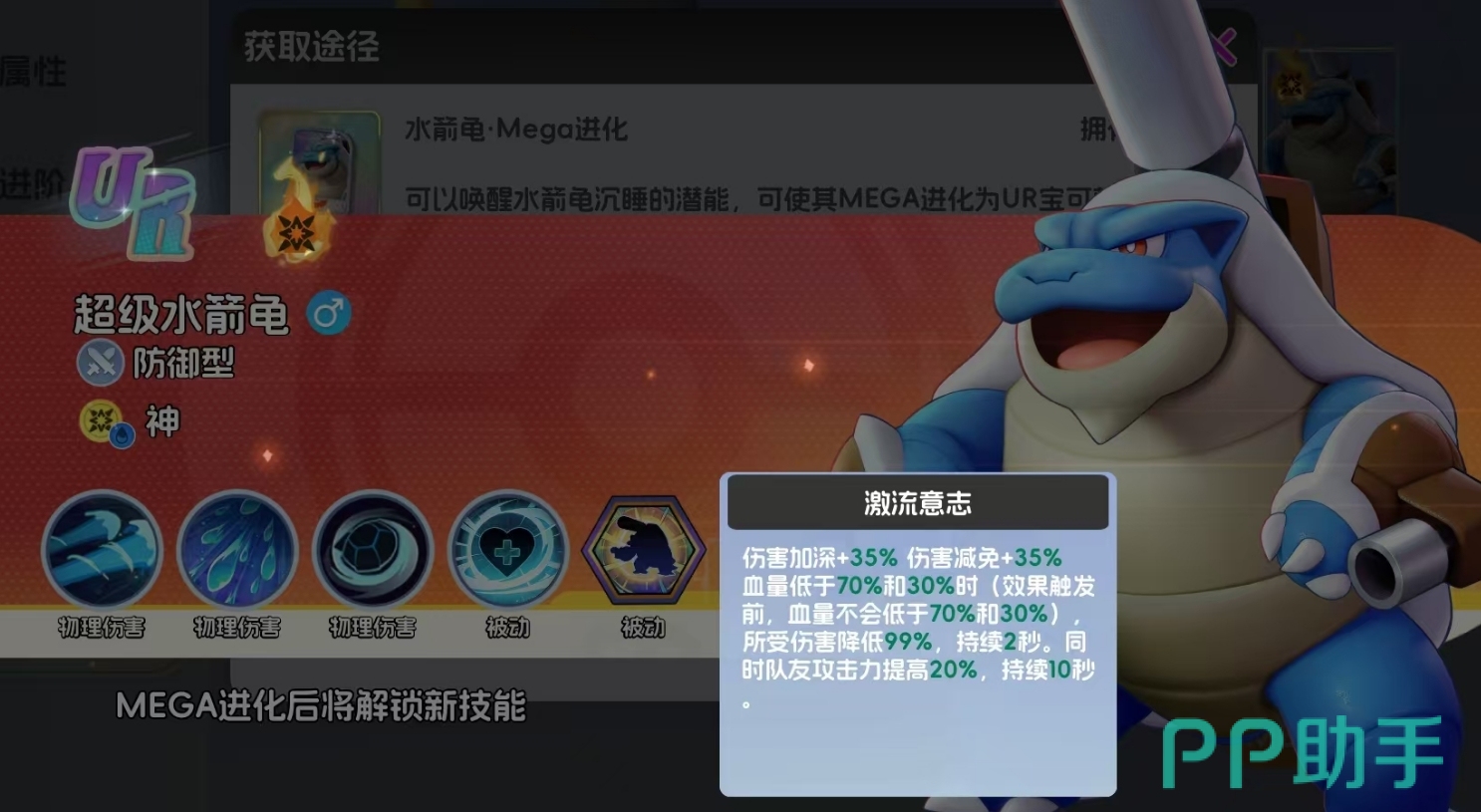 游戏内召唤上限为SP级,而UR属于独立于常规星级体系之外的特殊品阶。所有SSR及SP品质的宝可梦,只要满足条件,均可触发MEGA进化,成功后不仅品级跃升为UR,还将同步解锁专属新技能,并呈现全新立绘形象。该过程分为两大硬性门槛:阶段升阶达标与MEGA进化卡激活。