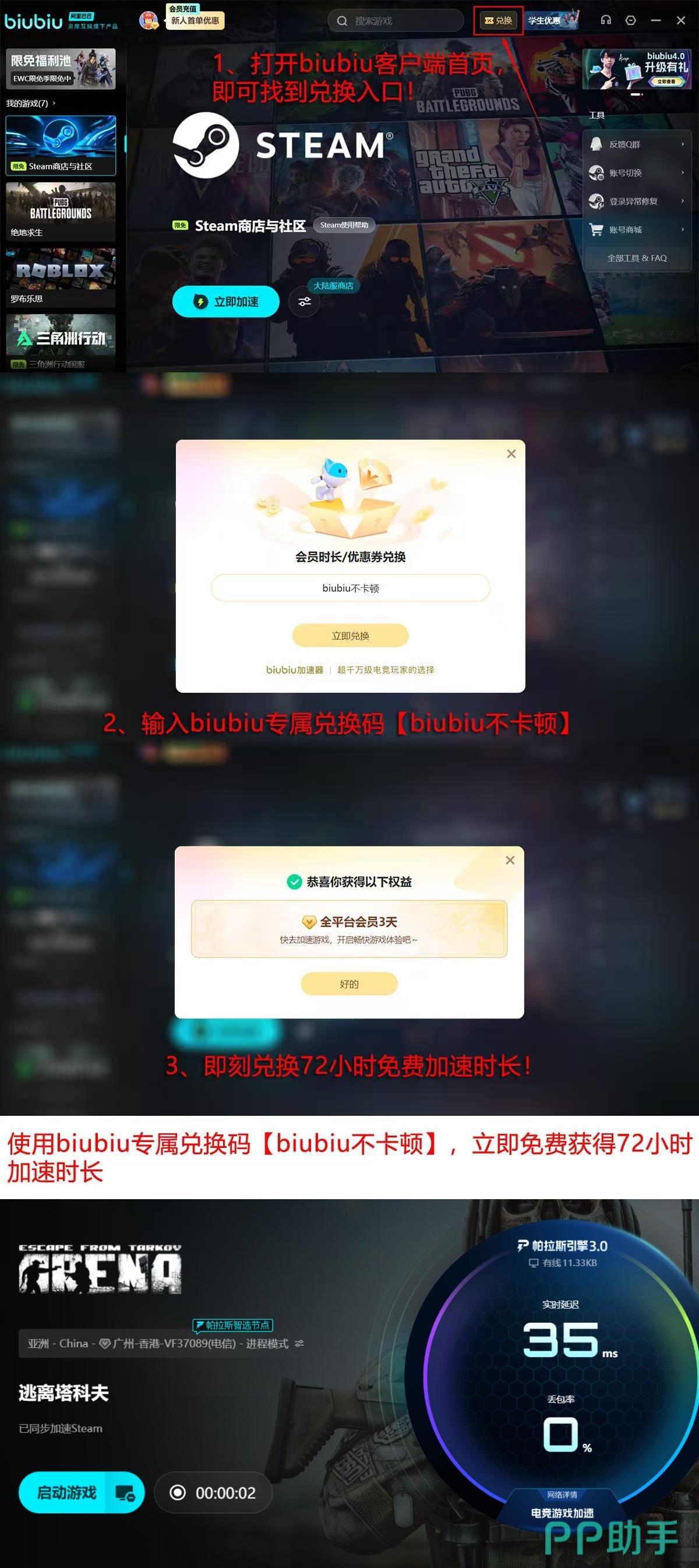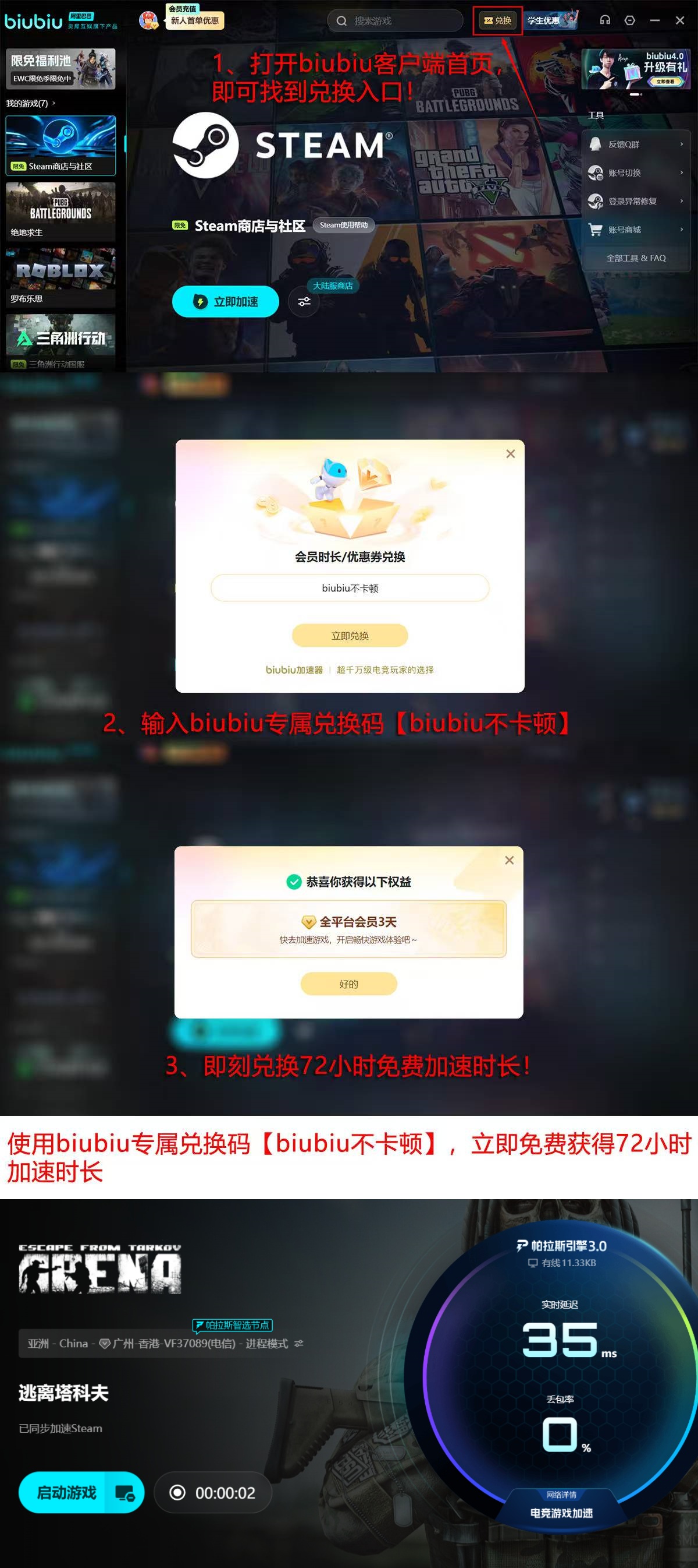 新用户注册后可立即获得24小时全游戏免费加速权益。若需延长试用周期,输入兑换码【biubiu不卡顿】,即可额外激活3天不限时加速服务,适用于《逃离塔科夫》及其他所有支持游戏。