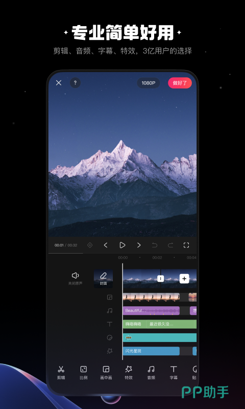 这款App给人的印象是界面清晰,工具排布一目了然,涵盖了剪辑的常用功能,如分割、变速、画中画、关键帧等,该有的都有。虽然没有太多花哨的模板,但运行稳定,操作跟手。
