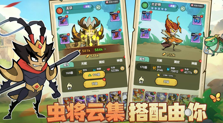 甲虫猛将和蜻蜓谋士的萌趣造型,重塑了三国背景,全自动挂机机制覆盖主线、资源采集和副本挑战。离线状态下,也能持续产出金币和经验,适合碎片化时间游戏。动态沙盘战场中,前后排站位和武将羁绊,都会影响战局,多种职业自由搭配。微调角色站位,就可能逆转胜负,打破了放置卡牌纯数值堆砌的弊端。角色养成包含技能强化、星级突破和属性专精,没有固定等级上限。