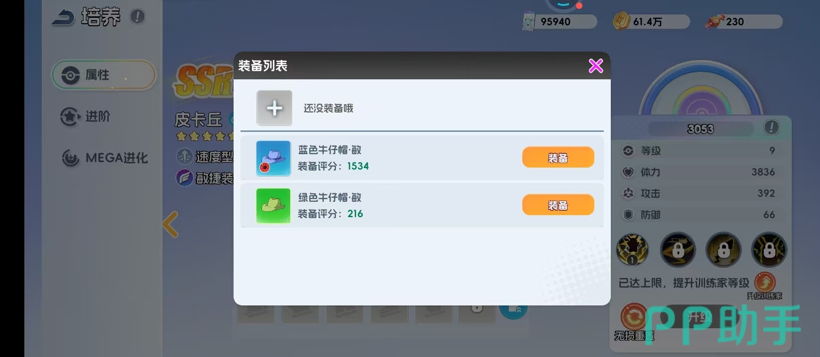 当玩家在获得皮卡丘之后,等级成长就会影响到速度,还有攻击面板。在进阶系统中,可以将基础生命,还有防御属性从原本的115%提升到149%这就是一个改变的关键。每一次的升阶都意味着在战场上,无论是输出上限还是生存能力都可以得到明显的提升。在装备列表中可以选择绿色短巾或者是蓝色牛仔帽。这一类敏捷装备就成为皮卡丘的主要选择,蓝色牛仔帽就可以带来可观的敏捷加成,强化速度优势。