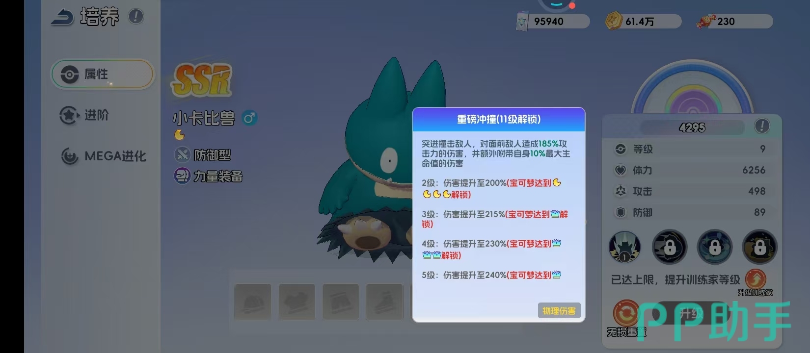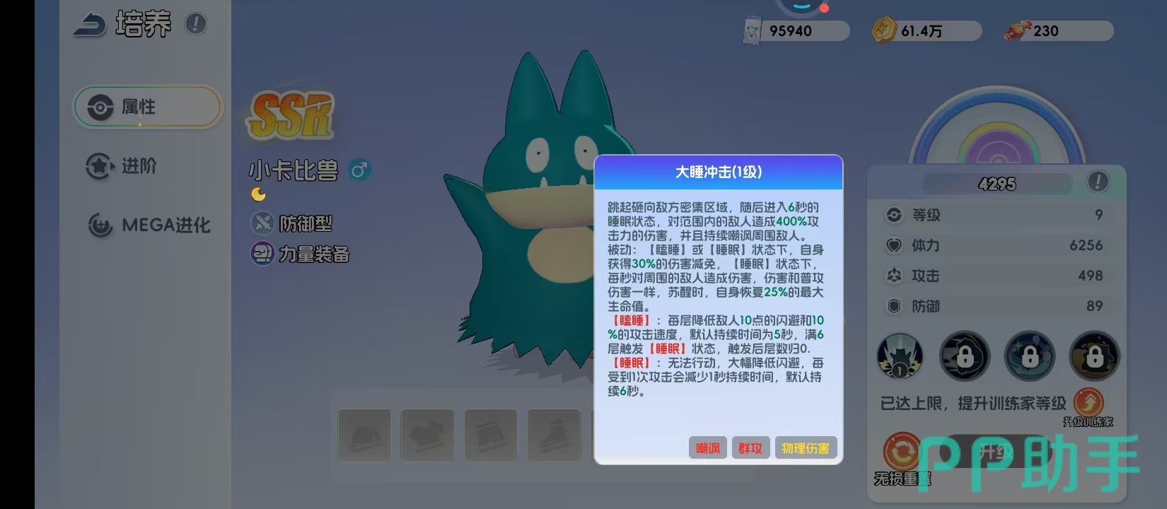 小卡比兽的基础面板就已经奠定他的地位,初始的体力值是6256在同等级中被称之为翘楚。配合防御型的定位,让他在初期就能够站稳脚跟,给后排输出创造出安全的输出环境。它的定位比较清晰,高容错率的团队核心,而并非是单纯性的伤害输出。在升阶系统中,小卡比兽的成长曲线是比较平滑的,每一次升阶基础生命还有防御力都会有迅速的提升。让他在游戏周期随时都能够保持竞争力,再提升到下一个阶段时,核心技能在提升等级之后,伤害还会增强。