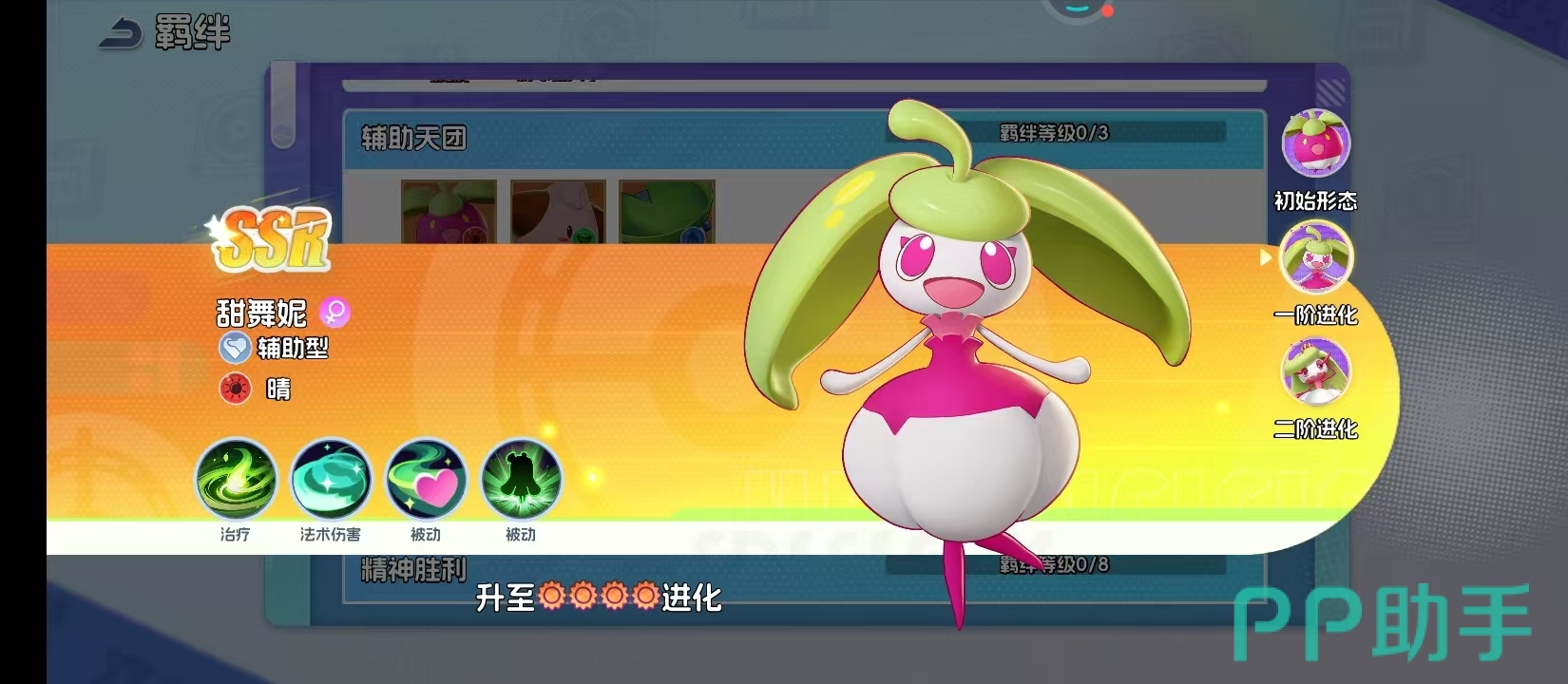 到了后期就会进阶成甜舞妮。这个时候就会没有一开始的稚气,而是拥有绿色的长发。开始会学习用一些具有攻击性的方式去保护自己或者是队友。每一次的攻击都会拥有热带阳光的灼热,每一次的旋转都好像是花瓣一样的优雅,并不再是躲在队友背后的那一个小果子,而是成为了一个舞者,能够独当一面。在无数次的战斗中都可以磨砺出坚韧的意志,最后就可以通过进化变成甜冷美后。