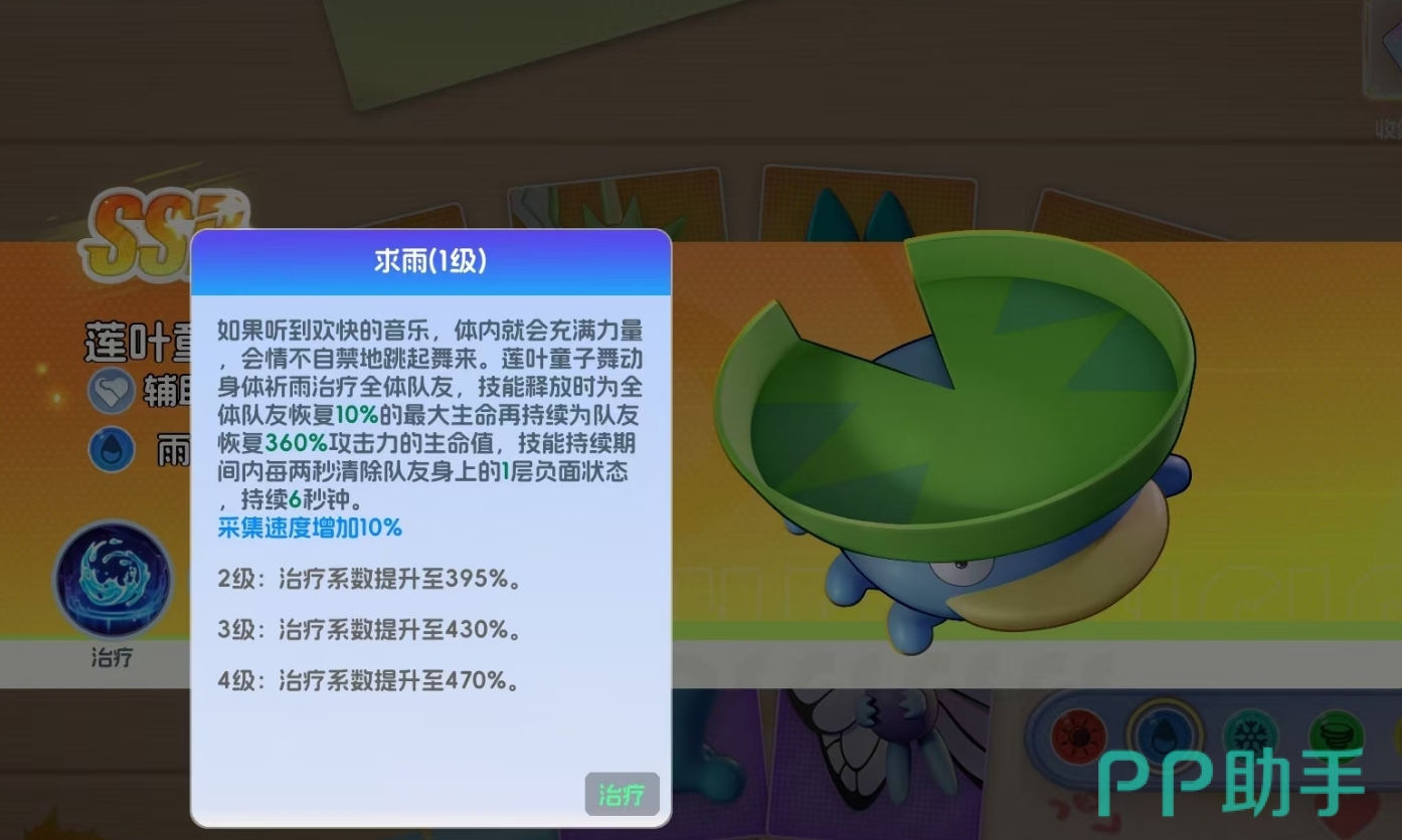 莲叶童子的大招求雨是它最为关键的技能之一,释放后全队都能享受到由莲叶童子提供的治疗效果,而且大招在持续期间还会每隔两秒清除掉友军宝可梦身上的一层负面,最多能清除掉三层,也令莲叶童子大招极其实用,在实战中只要一开,队友们基本上就不用担心再被负面状态给控住了。同时,11级就能解锁的寄生种子也具备不错的治疗能力,释放后莲叶童子会自动选定己方生命最低的宝可梦,并为它施加治疗效果。