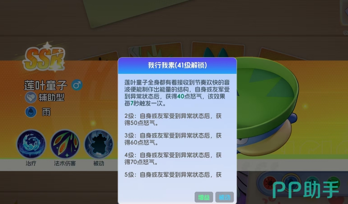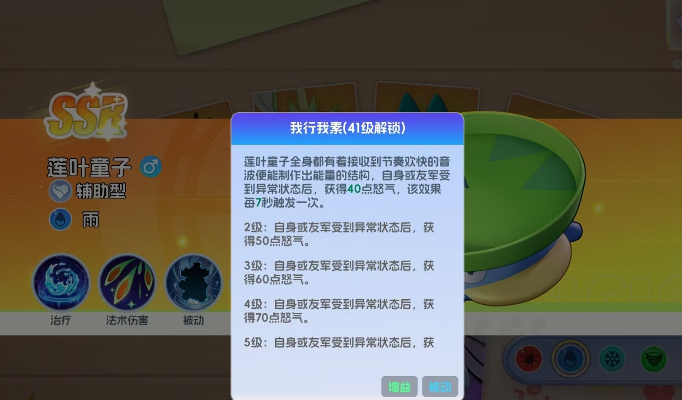 回怒也是莲叶童子的特性之一,只要它的等级达到了41级,便能解锁被动我行我素,只要自己或队友受到了异常状态,就能立刻令自己回复怒气。虽然说该效果有七秒的冷却,但依然能让莲叶童子释放出更多的大招,从而为队友解除负面,等该技能等级高后,很容易就会出现其他宝可梦只释放了一次大招,莲叶童子却已经完成两次大招释放的情况,这也令莲叶童子在等级高时会拥有更多的出战空间,成为玩家在面对一些负面效果多的阵容时必上的宝可梦。至于莲叶童子最后一个技能,则是能为它提供更多的血量和防御数值,让它的生存能力得到强化。
