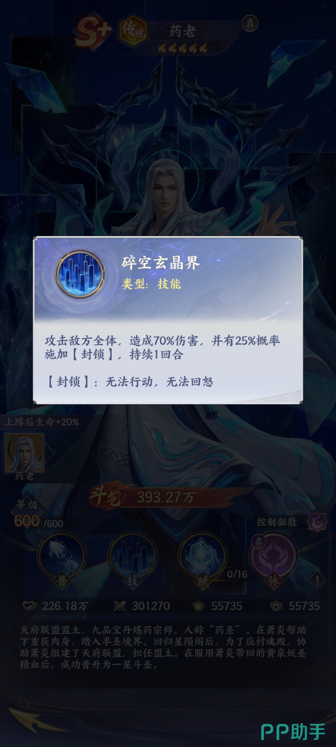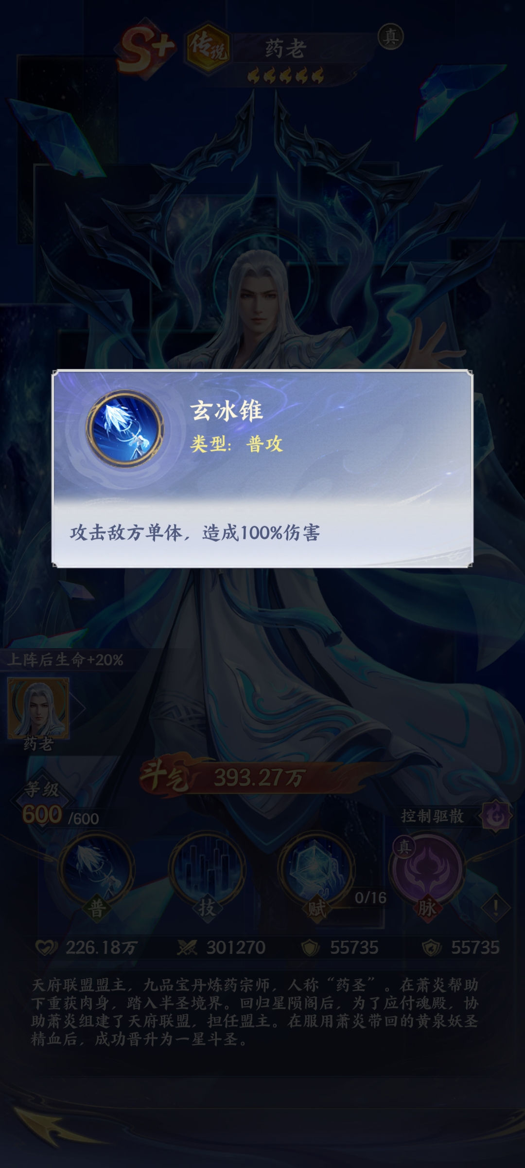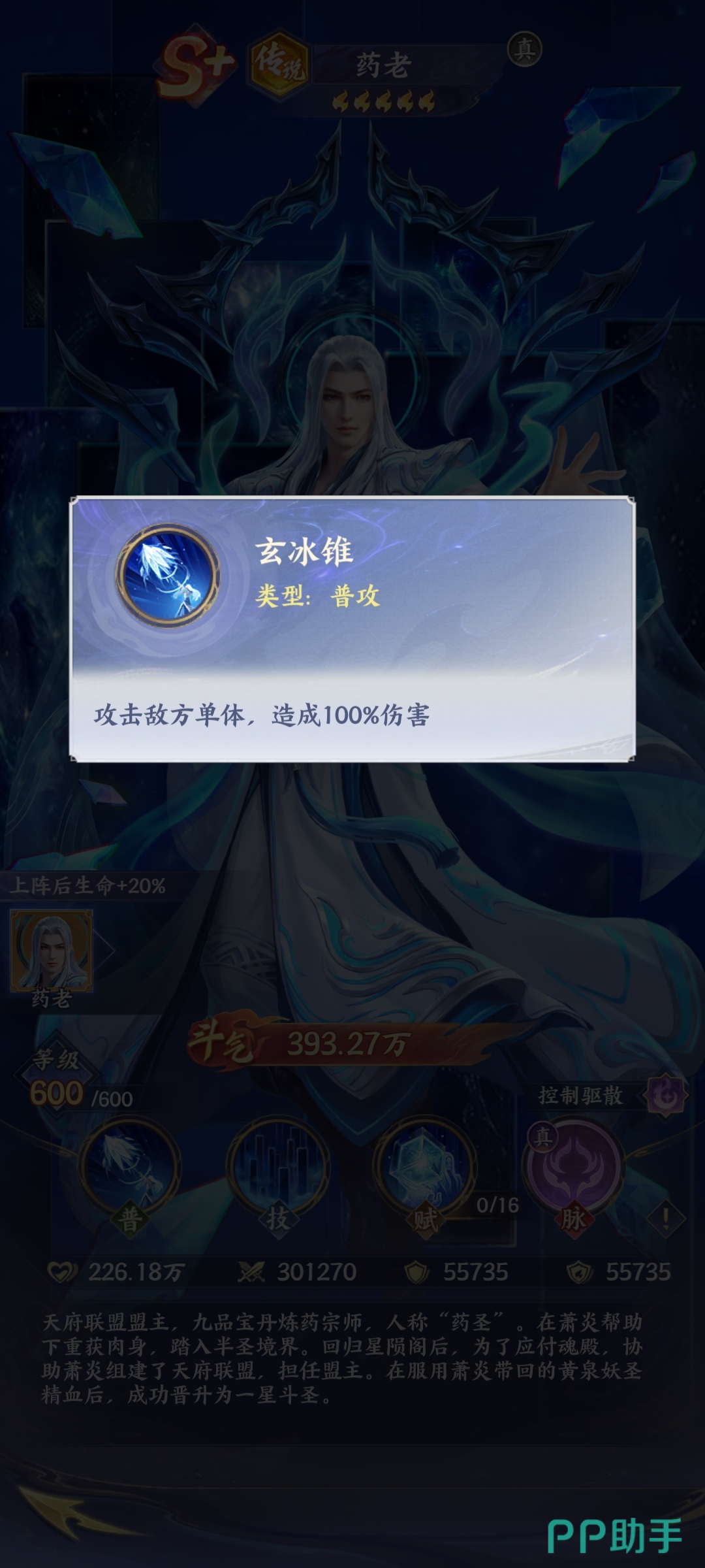 玩家如果想要知道药老的玩法,其实就需要知道药老的技能特点。药老既然是传说类型的斗者,他其实实力是比较强悍的,主要是控制的作用。简单来说就是在战斗的过程当中能够起到控场的效果,并且还能够达到增益的作用。所以说玩家在合理运用药老的时候,一旦施展普通攻击技能玄冰锥。虽然是基础攻击,但是能够对敌人造成高额的伤害,他也是稳定输出的辅助。
