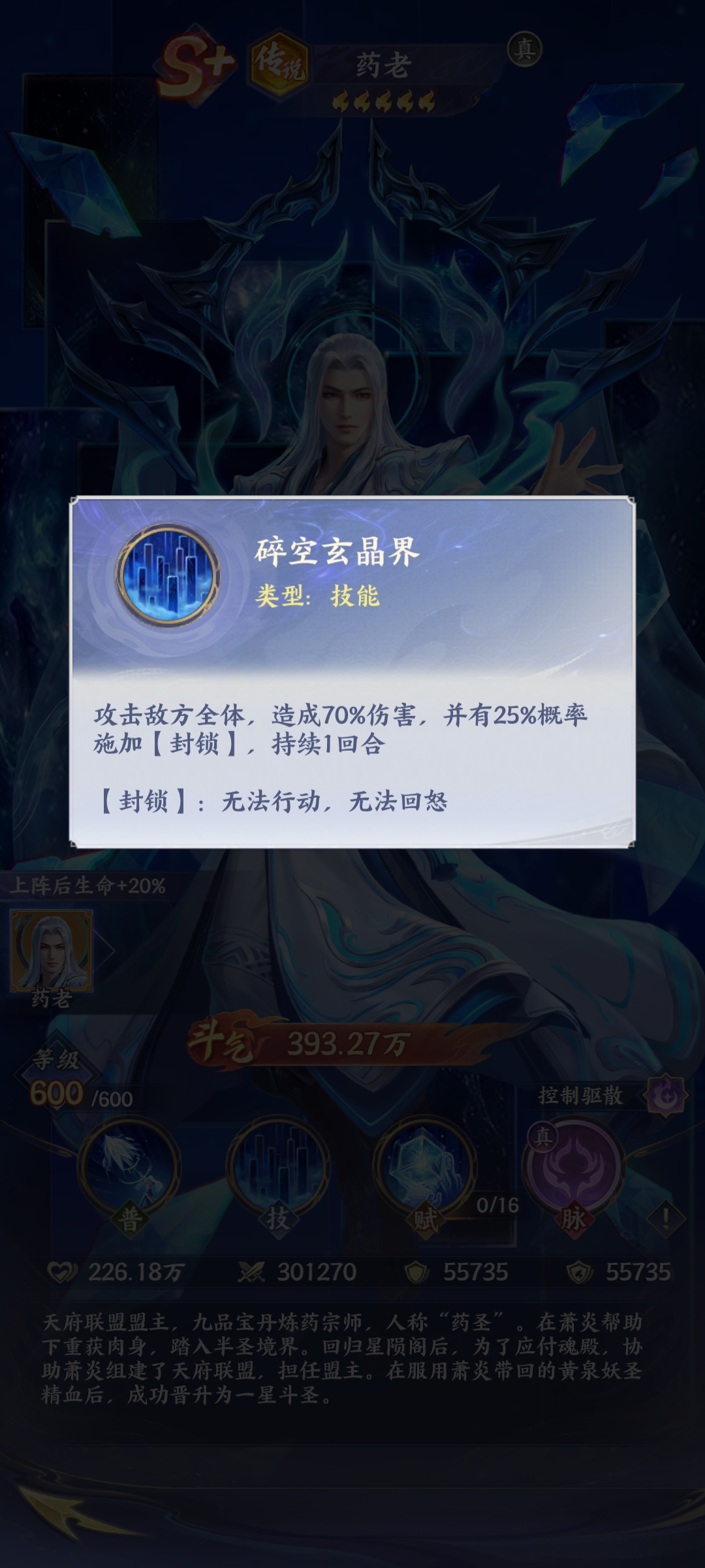 药老的核心技能是碎空玄晶戒,这个其实深入了解就可以发现他作为核心的技能,能够有效地攻击敌人的全体,从而造成高额的伤害,额外还会有一定的概率能够封锁效果,在这样的情况下,敌人是不能够进行行动的,如果敌人不能够行动,也没有办法回怒,那么在这样的情况下,整个队伍的输出将会大幅度的上升。