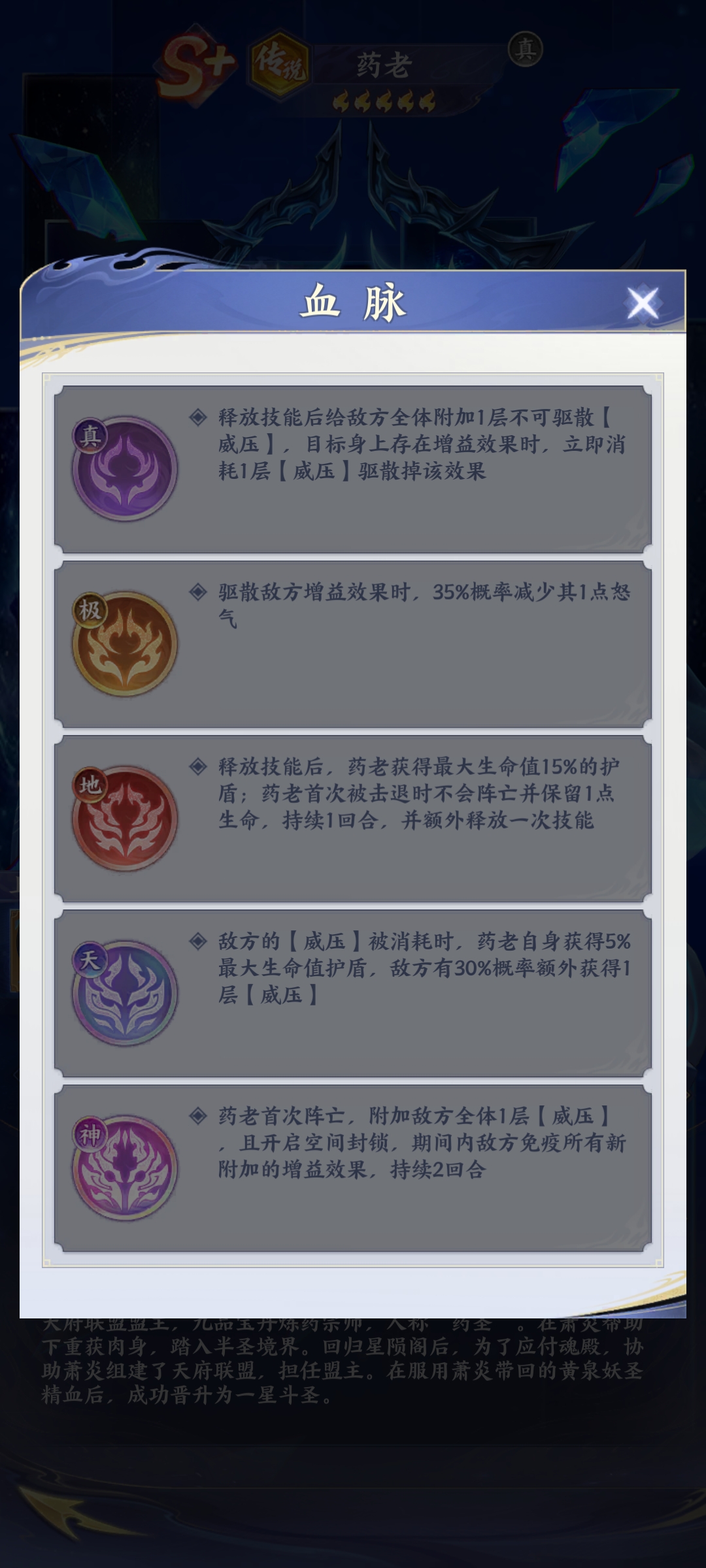 而对于玩家来说,药老的核心机制是驱散和封锁,他的天赋跟血脉主打的就是围绕驱散展开,一旦形成之后,能够有效的克制整个队伍的增益作用,并且封锁再一次提高了控制效果。所以对于大部分玩家来说,当他们熟悉了药老的整个技能特点之后,想要将药老发挥出关键的实力。这时候玩家就需要尽可能的去提高他的天赋跟血脉系统。