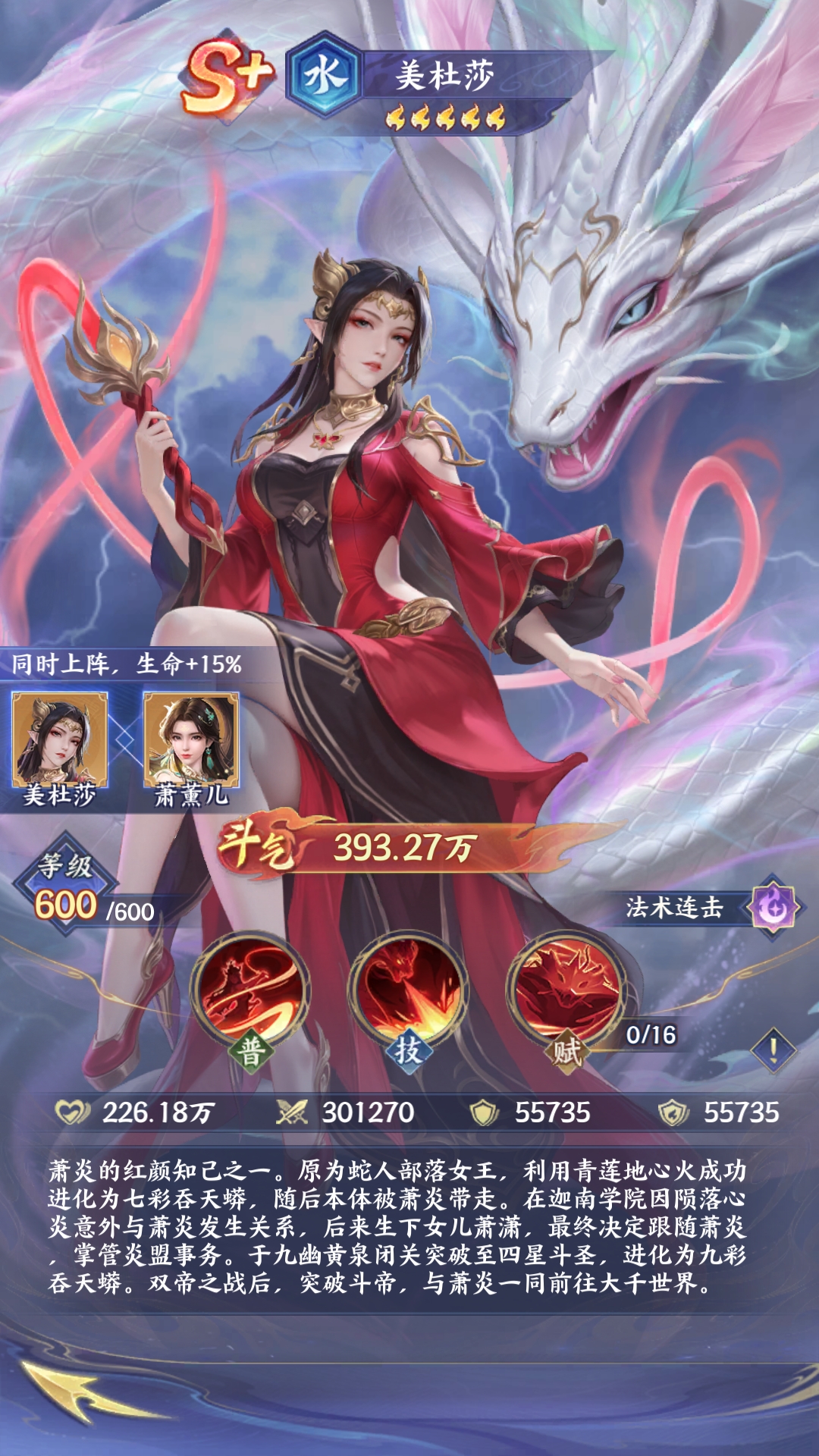 美杜莎(水·法术连击):主要的定位就是法术连击,它的技能机制就可以有效满足爆发输出流的阵容。蛇影噬心这一个普通攻击就可以有效触发多段法术伤害。七彩吞天蟒这一个技能在释放之后就可以针对敌方全体造成高额的伤害,并且还会有灼烧的效果。配合天赋九彩净化,在每一次攻击时都有概率可以触发额外的连击,在一瞬间就可以打出爆发性的输出。他和萧薰儿的羁绊就能提升15%的生命加成,进一步的提升续航的能力,所以这一个角色也是值得选择的。