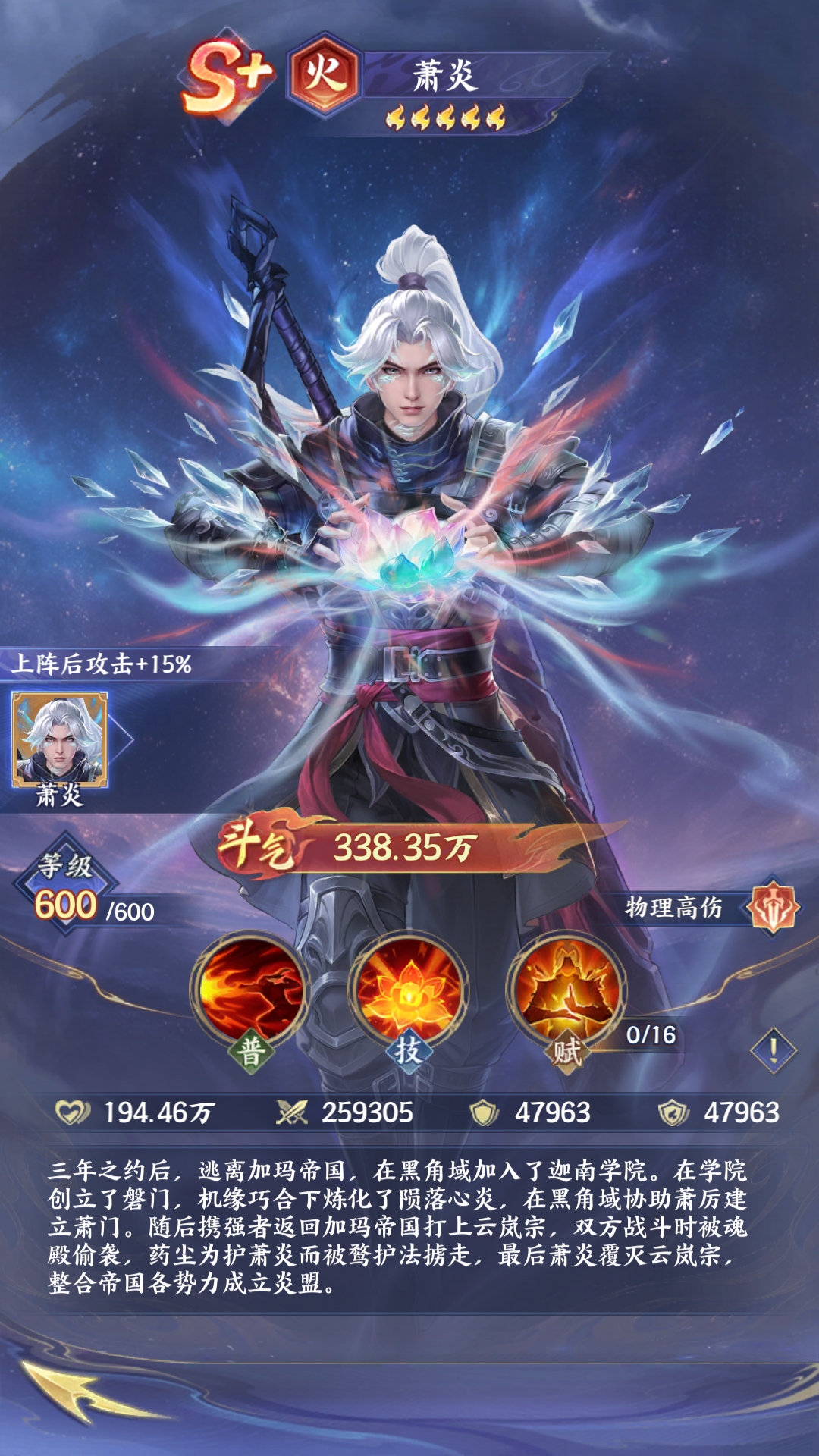 萧炎(火·物理高伤):作为原著中的主角,在游戏中依然会延续火属性爆发的特色,它的普通攻击可以针对单体造成物理性伤害。陨落心炎这一个技能可以针对敌方的前排展开破甲打击,还有天赋技能,在战斗的过程中就能迅速的提升自身的攻击,可以说简直是越战越勇。如果搭配美杜莎等角色,那他的输出就能够完全发挥出来,在物理输出流阵容中是一个核心的的输出点。