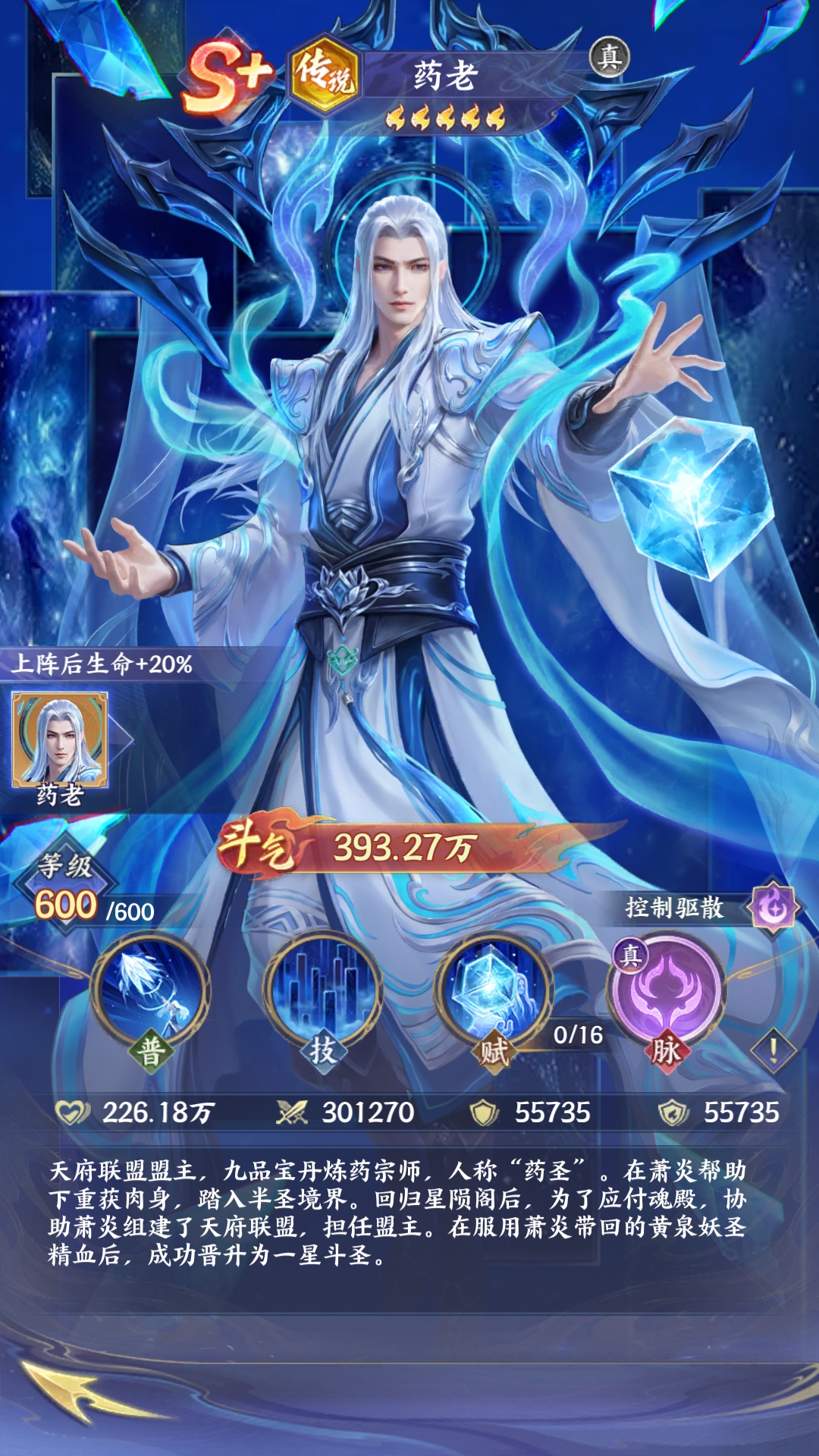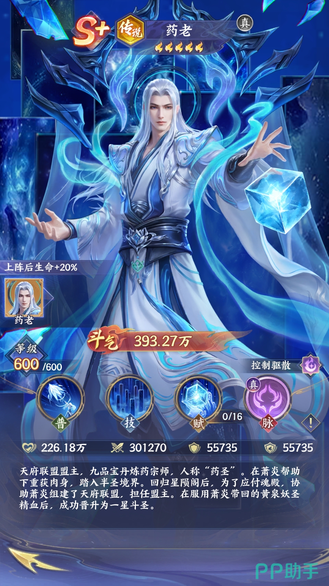 药老(真·传说):作为九品宝丹炼药宗师,在游戏中主要是以控制、驱散作为核心。是目前版本没有办法替代的一个辅助天花板,他的普通攻击还有技能就会有群体减速以及沉默的效果,可以限制敌方的输出节奏。药圣之威就可以有效驱散全队的负面状态,并且还可以给全队带来20%的生命加成羁绊效果。可以大幅度的提升团队的生存能力,在PVP对战的过程中,他的控场能力就可以让敌方直接陷入到瘫痪中。在PVE副本中,它的驱散效果就是应对BOSS减益机制的关键,无论是开荒高难度的副本,还是冲击竞技场排名,都是阵容中的稳固选择。