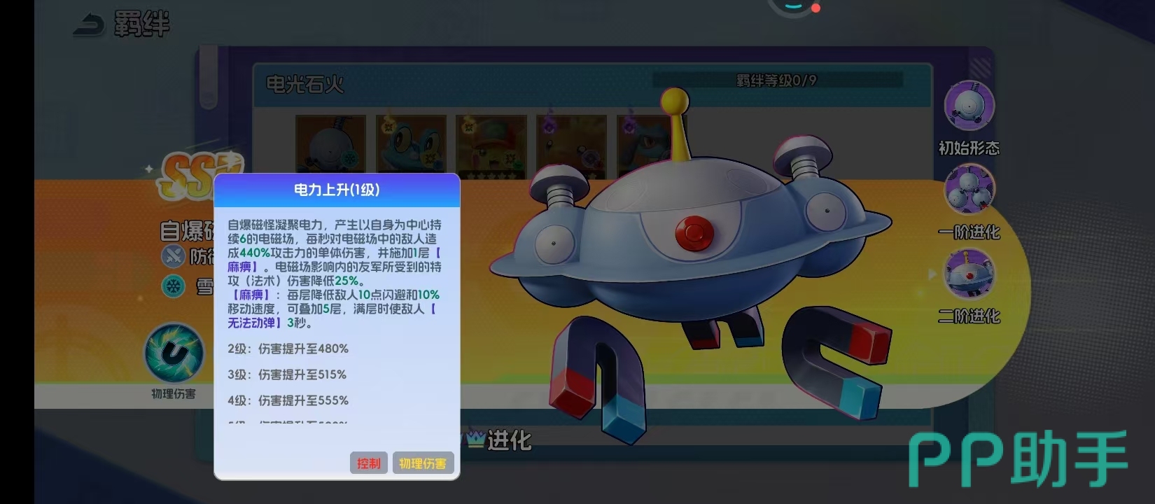核心主动技【电力上升】可释放持续约6秒的环形电磁场。作用范围内敌人每秒承受等同于自身攻击力440%的雷电伤害,并附加麻痹状态。该技能的战略意义远超单体输出:麻痹效果具备明确的层数机制——每层降低目标10点闪避值与10%移动速度,最高叠加5层;叠满后触发强制控制,使敌方单位陷入无法行动状态。这意味着自爆磁怪能通过持续施压,系统性瓦解对手机动性与反应能力,为团队创造决定性输出窗口。