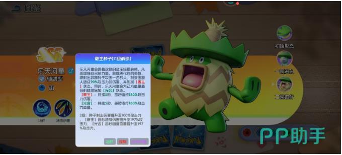 在最后进阶之后就会变成乐天河童 ,这就是一个全能辅助的终极形态。此时头上的帽子就出现了变化,作为一个二阶进化的形态。他的辅助能力就会进入到巅峰的状态,尤其是11级解锁的核心技能,就会让他在团队中成为一个无可替代的存在。这一个技能就可以让他的嘴巴直接变成机关枪,一下子就可以喷射出好几颗种子,然后攻击敌人,不仅可以造成高额的法术伤害,同时还会拥有寄生的状态,可以持续针对敌人去造成伤害。能达到持续治疗队友的作用,在团战的过程中是拥有多重优势的,难怪被称之为全能辅助大师。