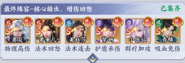 美杜莎+小医仙+紫妍+萧薰儿+青鳞+萧炎:这一个阵容主要是将防御续航输出结合在一起,就成为玩家登顶斗破苍穹的终极选择。萧炎这就是物理性的高伤核心,在队伍中就是绝对的输出主力,在真伤的光环下就可以爆发强大的伤害力。萧薰儿则是法术回怒角色,可以迅速的给全队积攒怒气,让核心技能就可以无缝的衔接在一起。加上小医仙的群聊辅助攻击,能迅速的提升全队的输出以及续航能力。