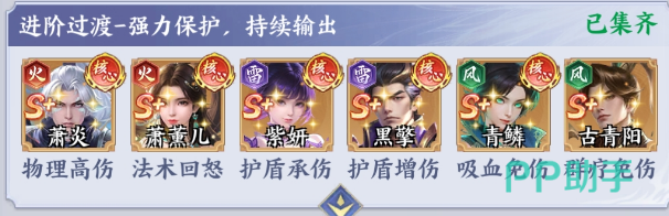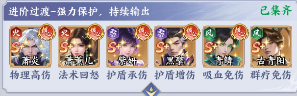 紫妍+黑擎+青鳞+萧薰儿+萧炎+古青阳:在这一个阵容中,作为主要输出点的就是萧炎,具有物理高伤核心,在护盾的保护下就可以稳定的输出。萧薰儿则是法术回怒角色,能迅速的给队友积攒怒气,让核心技能在释放的时候更加的频繁。古青阳具有群疗免伤的技能,可以有效提升队伍的生存能力,在持续作战的过程中没有后顾之忧。这套阵容主要是以护盾作为核心,可以打造攻防一体的体系,在面对高爆发的敌人时,始终都可以稳如泰山。