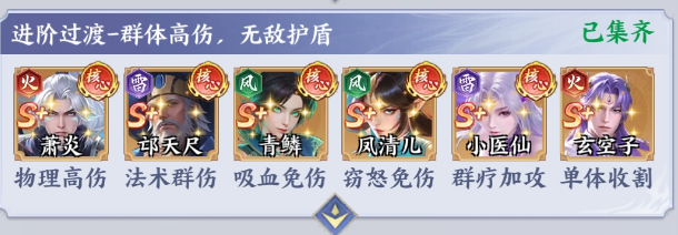 萧炎+ 邙天尺+青鳞+小医仙+玄空子+凤清儿:萧炎这就是物理高山的核心,配合邙天尺的法术群伤。就能有效形成双核心爆发,在短时间内就能清理敌方群体。青鳞拥有吸血免伤的特性,在群体输出的过程中就能保存自身的生存,拥有持续性输出的效果。玄空子则是单体收割角色,在群体爆发之后,就能有效收割残血,终结战局。