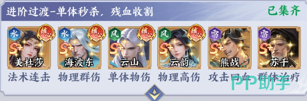 美杜莎+云山+海波东+云韵+苏千+熊战:这一套阵容是通过精准的单体爆发,迅速的瓦解敌方的核心,然后配合残血收割,让玩家在中期PVE还有PVP中就能够游刃有余。美杜莎就可以继续承担法术连击的核心输出,配合海波东的物理群伤,就能迅速的清理敌方的残兵。云山则是单体物理性伤害天花板,可以精准的锁定敌方核心C位。具有一击毙命的效果。云韵则是物理性高伤角色,在云山秒杀核心之后就能迅速的收割残血,扩大战果,把这些角色放在一起,那自然就会拥有更好的优势。