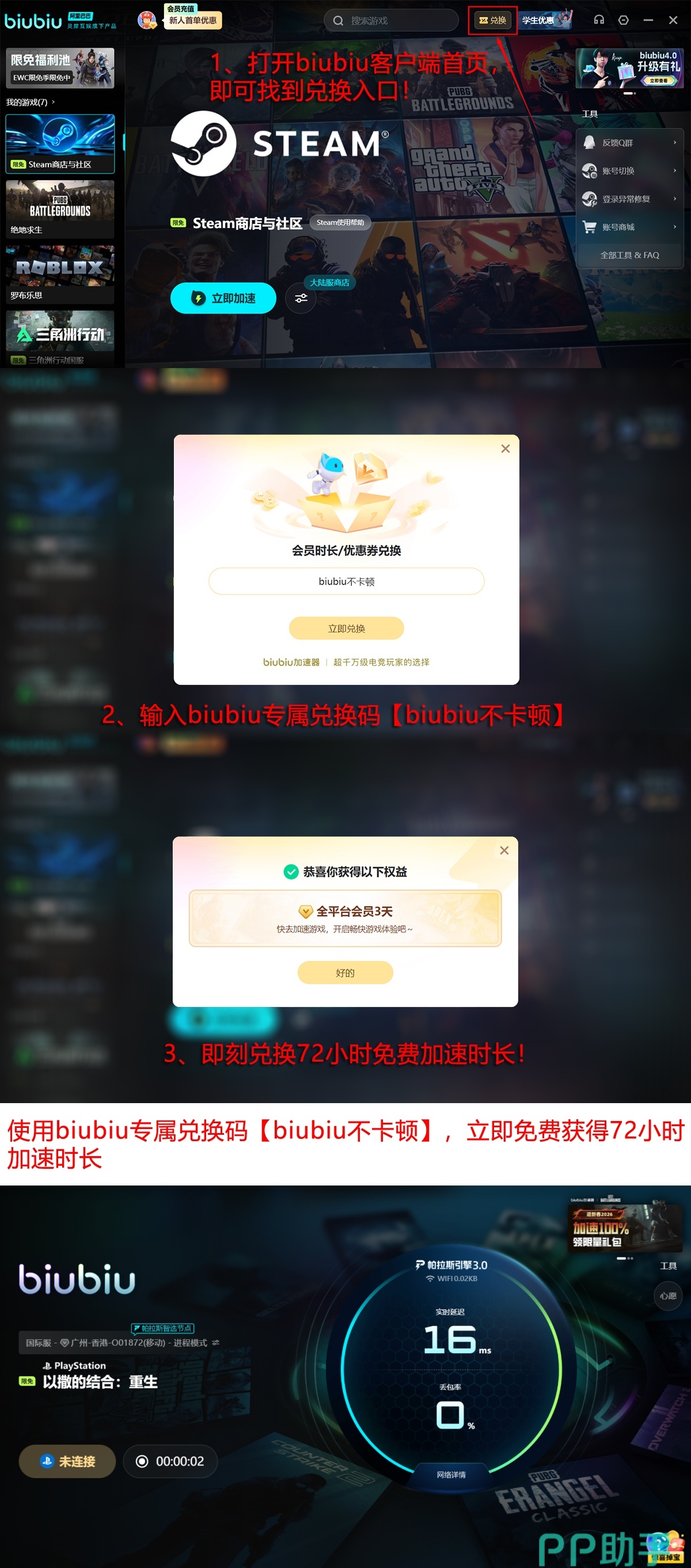 对于正在纠结的新人而言,现在就有一个非常好的体验机会。新号码注册biubiu,就能领得官方赠送的24小时免费时长。要是觉得效果好,想再用更多,所有的用户都可以输入这个口令【biubiu不卡顿】,额外兑换72小时全功能使用权益。也就是新人在叠加后,有累计96小时的试用,对玩家来说很实用。