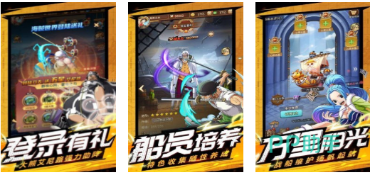 这款卡牌放置类手游也采用了回合制的基础玩法,可以打造自己的海盗船并获取形形色色的船员,登录上线就送豪华大礼包让大家轻松成长,游戏设定特殊也有着轻松的竖屏操作机制,剧情设定跟航海王漫画一模一样,超棒的战斗特效也致敬了原著动漫,各位航海王粉丝均可在这款大航海手游中获得快乐。