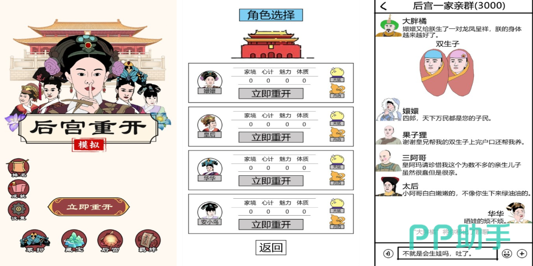 后宫重开模拟其实是款人生模拟主题的女性向游戏,这款APP可竖屏操作并利用文字对话进行交流,后宫场景加上人生重开的玩法还是很有代入感的,这款手游的设定操作都很简单很适合女生玩家体验,可以在后宫建造聊天群完成在线交流,无厘头的整体剧情呈现也颠覆大家对后宫主题的游戏的认知。