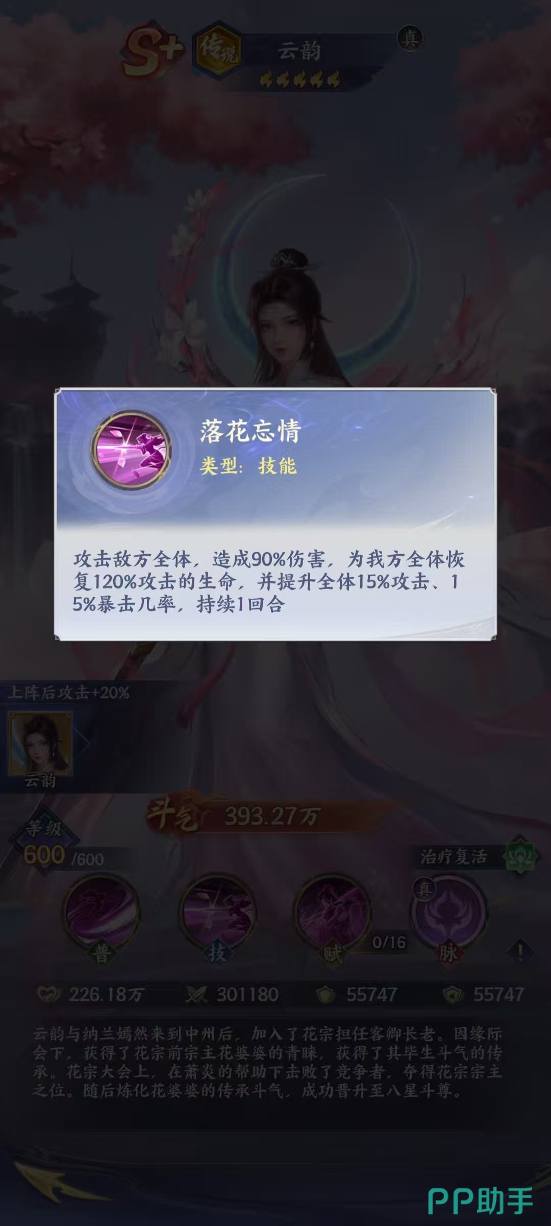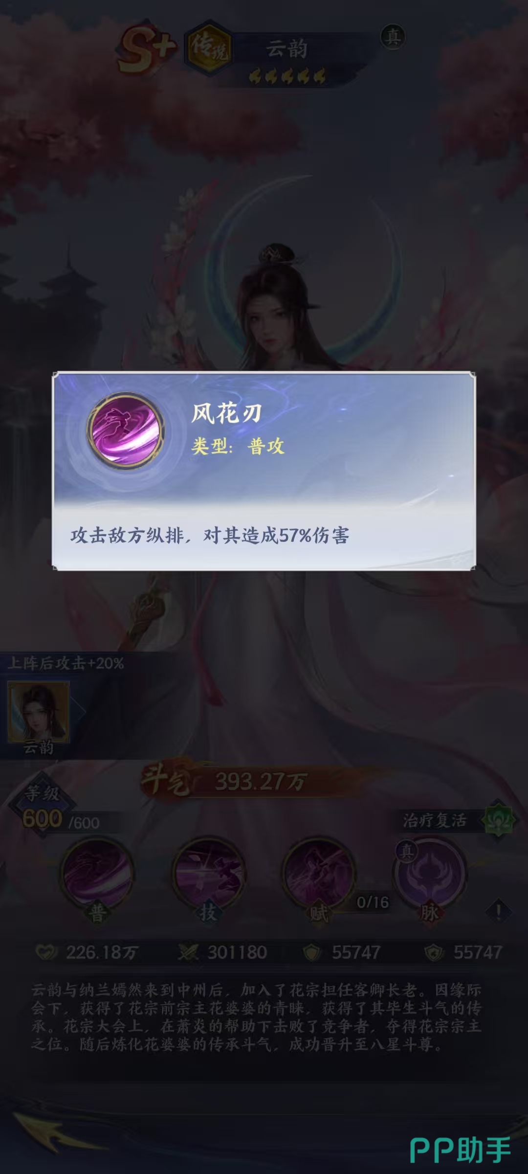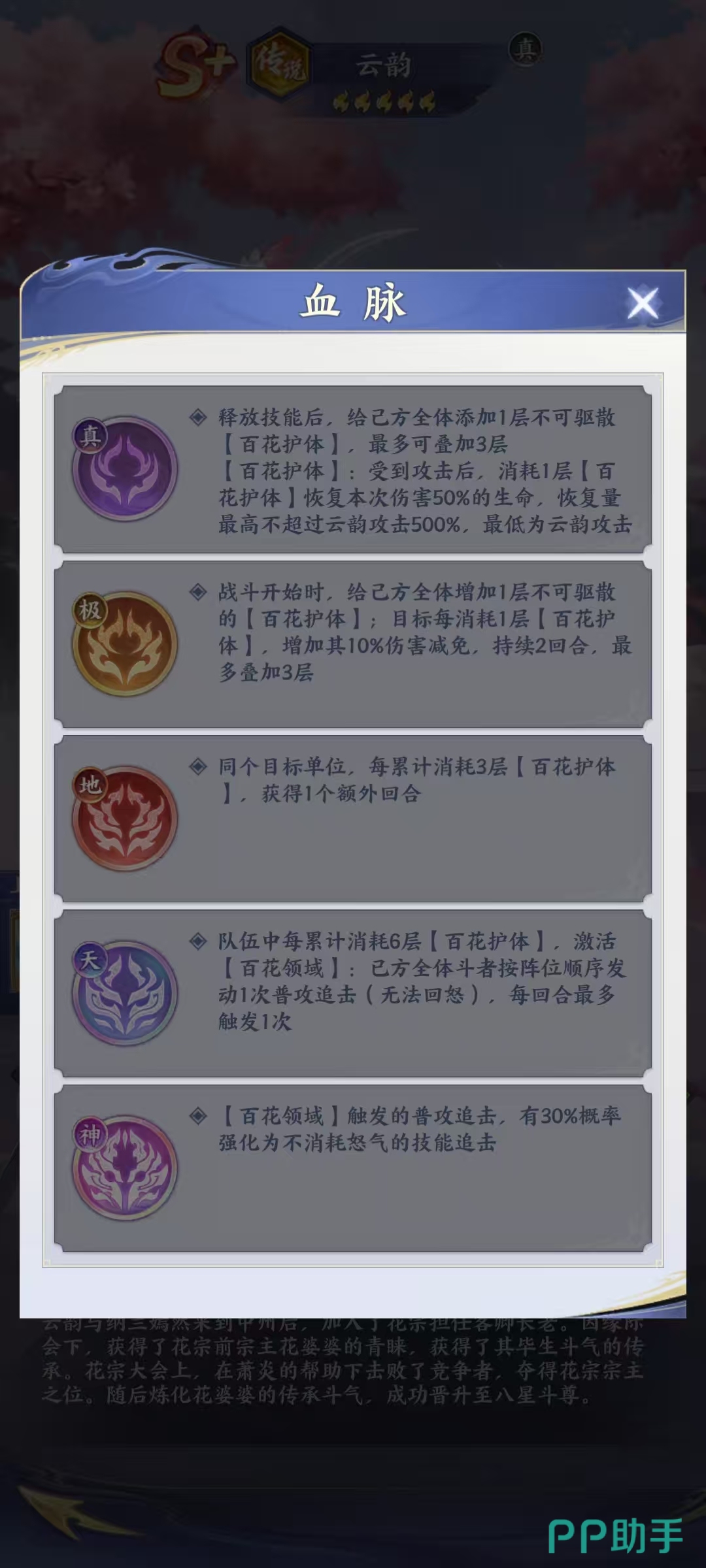 云韵是《斗破苍穹》手游内稀有度为“传说”的核心辅助型角色,身份设定为花宗宗主,同时也是主角萧炎的重要羁绊人物。其机制围绕“百花护体”展开,具备独特的团队续航、群体治疗、战中复活及阶段性减伤能力。在实际战斗中,她并非传统意义上的纯奶妈,而是通过技能联动实现攻防一体的节奏调控——既能稳定抬血,又可为输出角色创造安全环境与增益窗口。