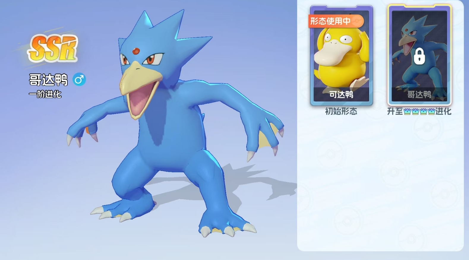 综上所述,哥达鸭虽为初始SSR品质宝可梦,获取难度相对可控,但其进阶路径清晰、资源消耗合理,且皇冠4阶完成后战力跃升明显。无论作为过渡期主力输出,还是与高星SP宝可梦协同作战,均具备良好适配性与战术延展空间。