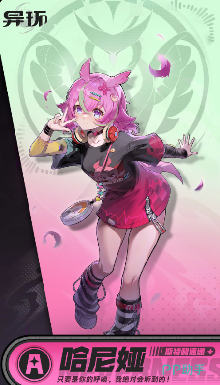 哈尼娅是《异环》中定位为A级的战术支援型角色,隶属虚构组织“斯特利速递”。其视觉设计以柔粉发色与仿猫头鹰耳羽状装饰为显著特征,颈部常佩戴功能性耳机,契合该组织以情报搜集、实时通讯及隐秘联络为核心业务的设定。从角色背景与技能逻辑推断,她主要承担战场信息枢纽与协同增幅职能。