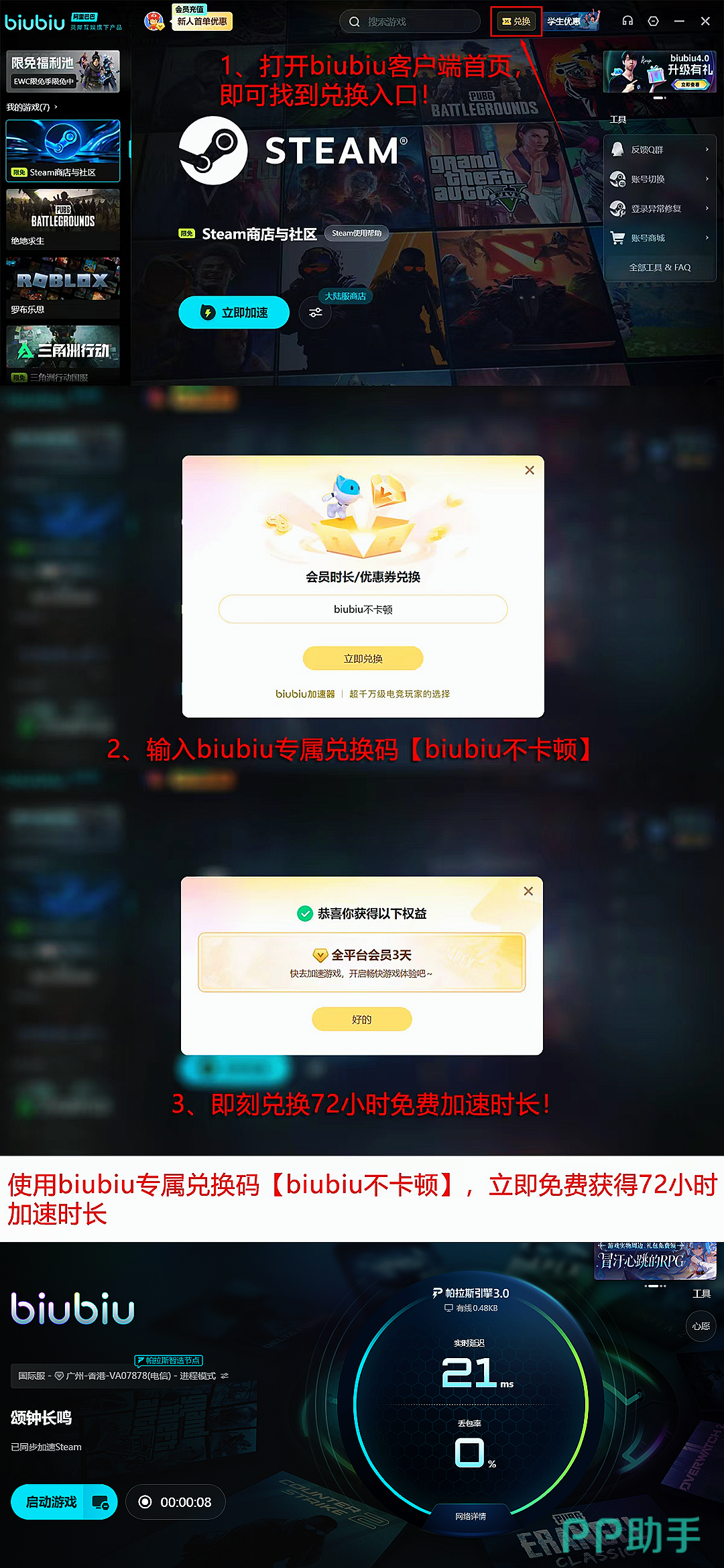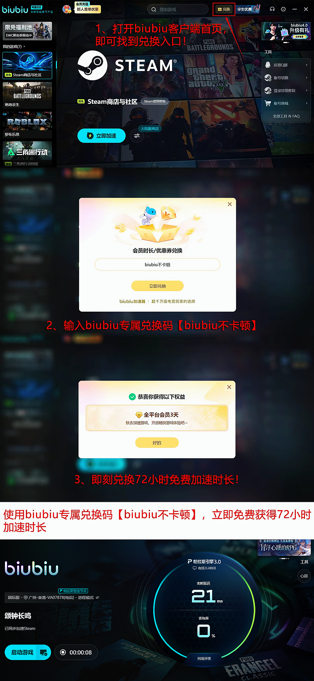 目前,biubiu加速器已获得大量PC端用户的持续好评。老用户凭兑换码【biubiu不卡顿】即可额外获赠3天全游戏通用加速时长;新用户完成实名注册后,立享24小时全场免费加速权益。两项叠加,单账户最高可累计激活96小时无限制加速服务。