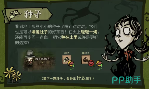 地面散落的野生种子为零成本初始资源,单次拾取获得3–5颗。生食恢复12点饱腹度;烤制后生命恢复提升至18点,饱腹度达22点;最优策略为投入农田种植——每粒种子成熟后产出6–8颗新种子,并可连续收获三季,是构建可持续粮食体系的核心起点。