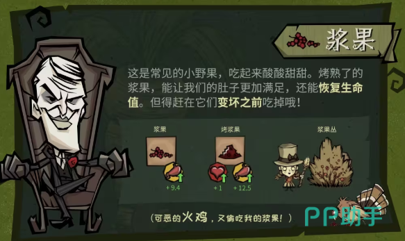 浆果丛呈簇状自然生长于林地与丘陵地带,采摘无冷却时间。生浆果提供10点饱腹度,无生命恢复;经篝火烤制后,饱腹度提升至25点,生命恢复增至20点,并额外赋予5点短暂护甲加成(持续30秒),适用于突发战斗前的快速状态补充。需注意:浆果腐败时间为6分钟,且火鸡有概率在角色背身时偷取半份存量。