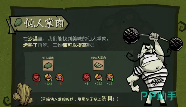 沙漠区域特有的仙人掌肉,采集需穿戴皮甲或以上防护装备,否则每次采集承受3点固定伤害。生食造成5点生命损失;烤制后转为正向收益,恢复25点生命值与30点饱腹度,且附带10秒耐热抗性(减免环境灼伤50%),是穿越高温地形的必备储备物资。