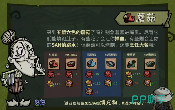 彩色蘑菇按颜色区分效果:红色蘑菇生食导致10点生命流失;蓝色蘑菇引发3秒眩晕并降低移动速度30%;紫色蘑菇使饱腹度强制归零。但全部种类经标准篝火烘烤6秒后,均转化为安全食品,统一提供20点生命恢复与15点饱腹度,是中期探索高危区域时的重要风险对冲资源。