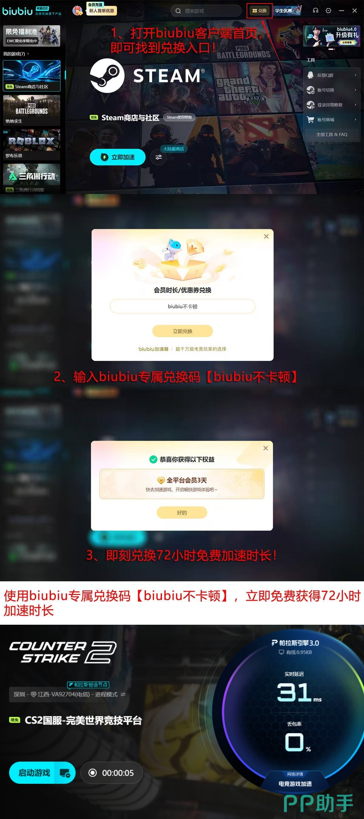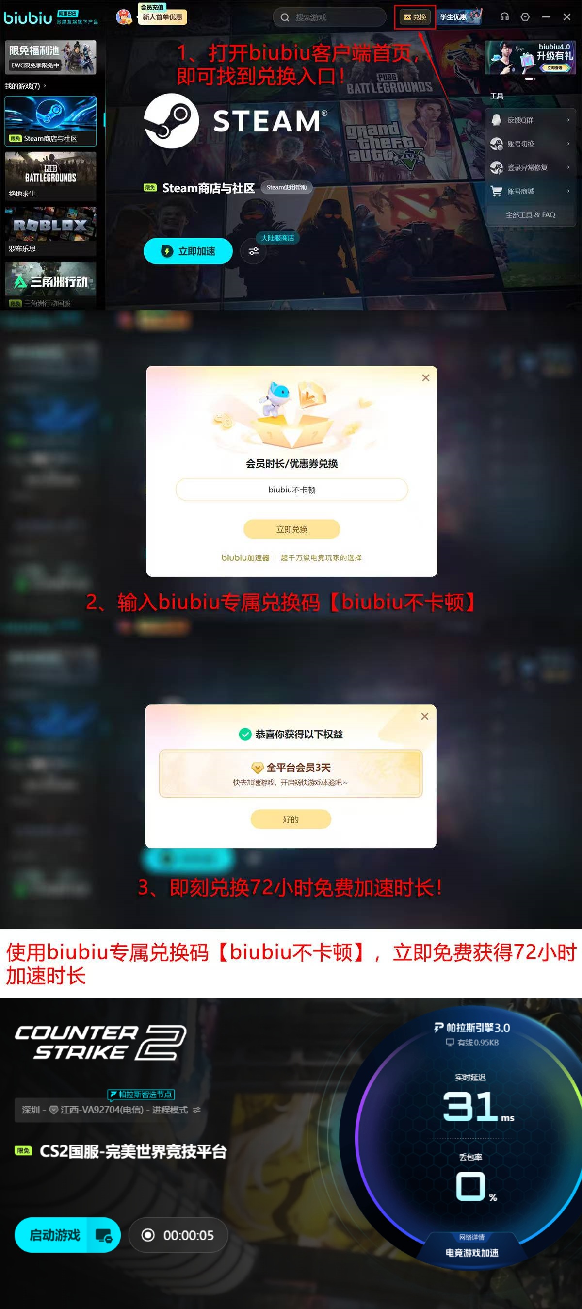 目前,biubiu面向新注册用户提供基础权益:首次激活可享24小时全游戏免费加速服务。若需延长使用周期,用户可在客户端内输入兑换码【biubiu不卡顿】,额外获得3日(即72小时)加速权限,叠加首日时长后,总计可体验96小时无限制加速服务。